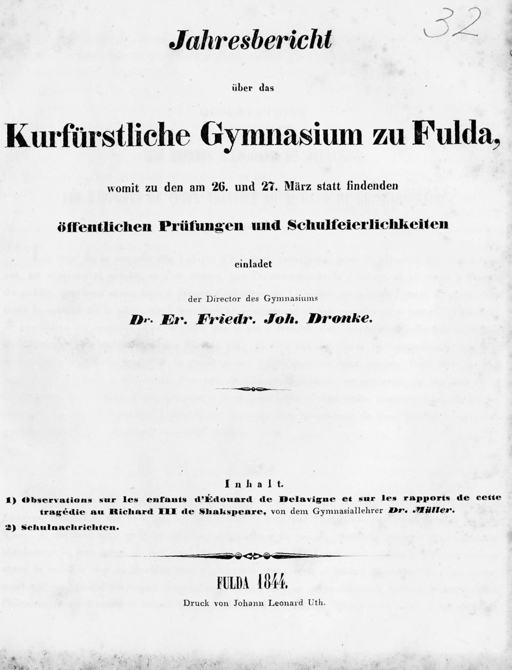 1) Obpservations sur les enfants d'Edouard de Delavigne et sur les rapports de cette tragédie au Richard III de Shakspeare, von dem Gymnasiallehrer Pr. Müller.