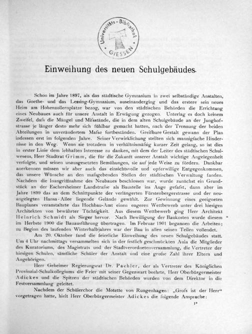 Nachdem der Schülerchor die Motette von Rungenhagen:„Grofs ist der Herr“ vorgetragen hatte, hielt Hlerr Oberbürgermeister Adickes die folgende Ansprache: