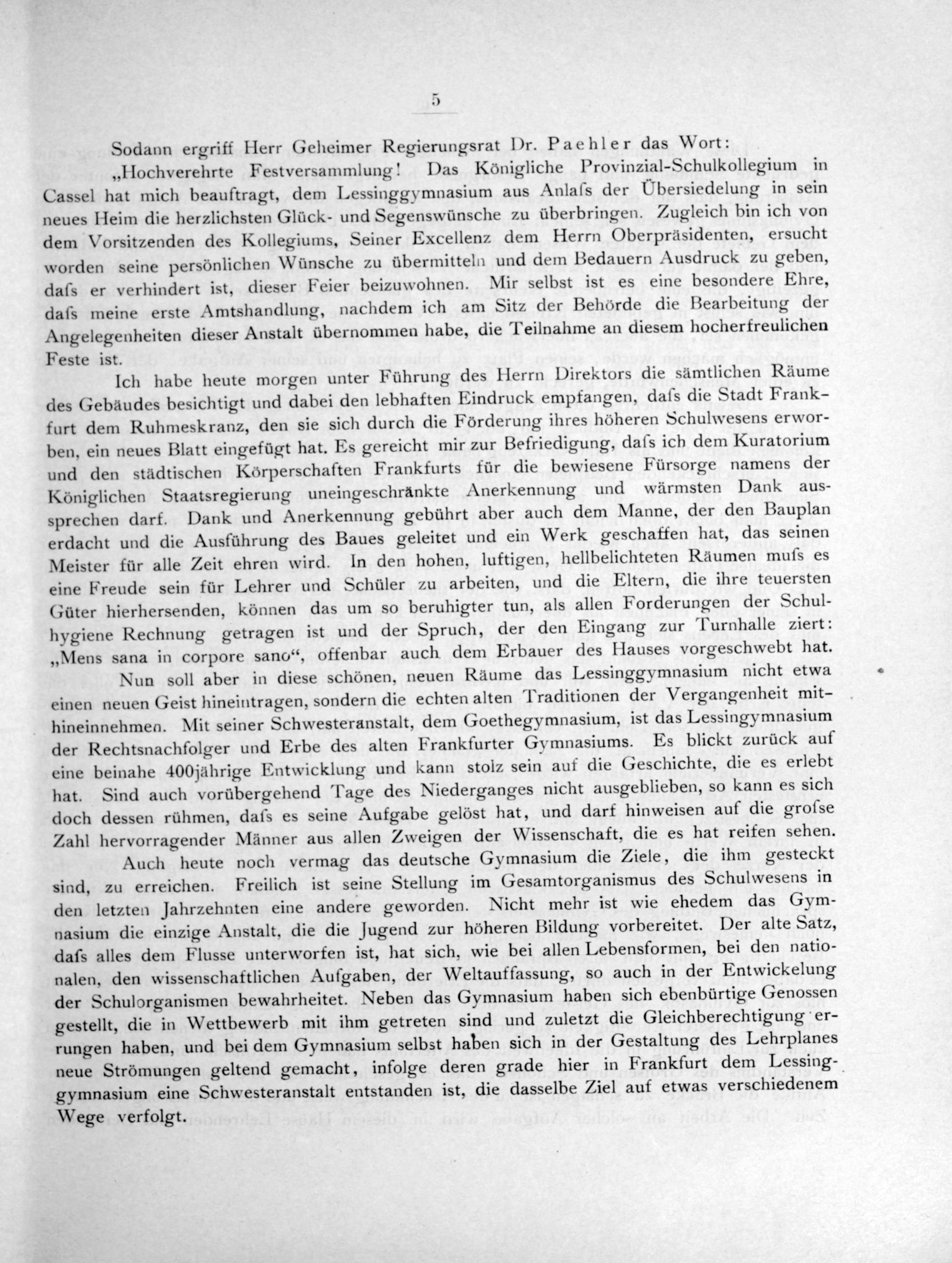 „Hochverehrte Festversammlung! Das Königliche Provinzial-Schulkollegium in Cassel hat mich beauftragt, dem Lessinggymnasium aus Anlaſs der UÜbersiedelung in sein neues Heim die herzlichsten Glück- und Segenswünsche zu überbringen. Zugleich bin ich von dem Vorsitzenden des Kollegiums, Seiner Excellenz dem Herrn Oberpräsidenten, ersucht worden seine persönlichen Wunsche zu übermitteln und dem Bedauern Ausdruck zu geben, dafs er verhindert ist, dieser Feier beizuwohnen. Mir selbst ist es eine besondere Ehre, daſs meine erste Amtshandlung, nachdem ich am Sitz der Behörde die Bearbeitung der Angelegenheiten dieser Anstalt übernommen habe, die Teilnahme an diesem hocherfreulichen Feste ist.