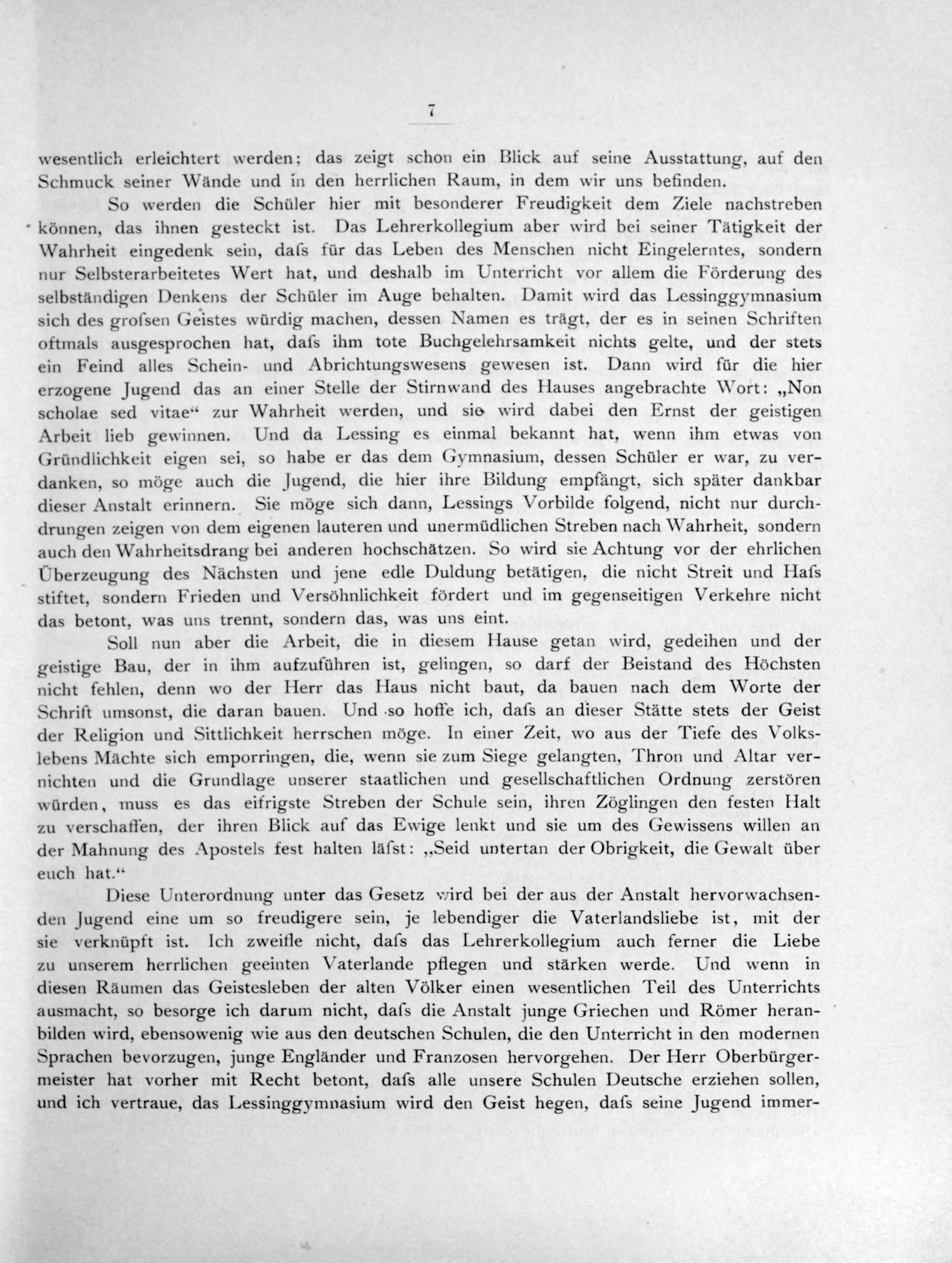 Diese Unterordnung unter das Gesetz wird bei der aus der Anstalt hervorwachsen- den Jugend eine um so freudigere sein, je lebendiger die Vaterlandsliebe ist, mit der sie verknüpft ist. Ich zweifle nicht, daſs das Lehrerkollegium auch ferner die Liebe zu unserem herrlichen geeinten Vaterlande pflegen und stärken werde. Und wenn in diesen Räumen das Geistesleben der alten Völker einen wesentlichen Teil des Unterrichts ausmacht, so besorge ich darum nicht, daſs die Anstalt junge Griechen und Römer heran- bilden wird, ebensowenig wie aus den deutschen Schulen, die den Unterricht in den modernen Sprachen bevorzugen, junge Engländer und Franzosen hervorgehen. Der Herr Oberbürger- meister hat vorher mit Recht betont, daſs alle unsere Schulen Deutsche erziehen sollen, und ich vertraue, das Lessinggymnasium wird den Geist hegen, daſs seine Jugend immer-