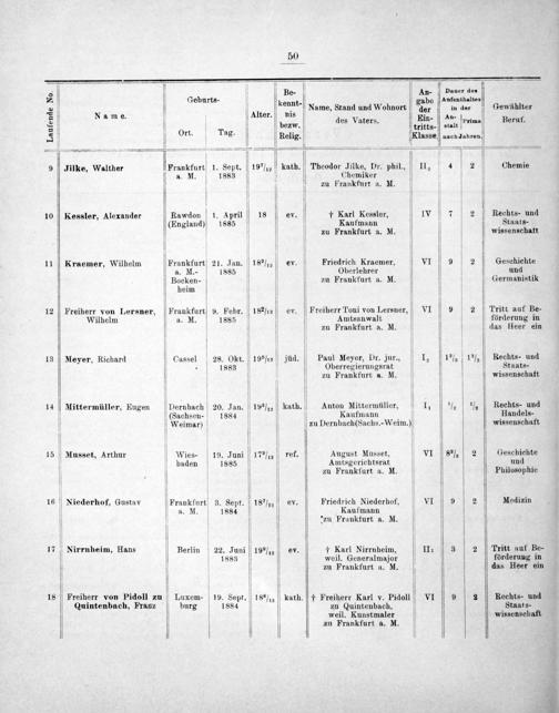 ſ ſ— S Be- An- Dauer des Z Geburts- nennt. gabe Aufemthaltes 82 Au nis Name, Stand und Wohnort der in der Gewählter am e. er. 8.. 8 be² des Vaters. V Ein- An-„rima Beruf. 8 ort Tag. ¹ 92w. tritts- stalt 8. g. Relig. Eiasse— ————————— V V V 9 Jilke, Walther Frankfurt 1. Sept. 19 ⁄12¹ kath Theodor Jilke, Dr. phil., II. 4 2(Chemie a. M. 1883 Chemiker G 2u Frankfurt a. M. Kessler, Alexander Rawdon 1. April I 18 ev. † Karl Kessler, IV 7 2 Rechts- und (England) 1885 Kaufmann Staats- zu Frankfurt a. M. wissenschaft V Kraemer, Wilhelm PFrankfurt 21. Jan. 18 ⁄2 ev. Friedrich Kraemer, VI 9 V 2 Geschichte a. M. 1885 Oberlehrer und Bocken- u Frankfurt a. M. Germanistik heim V . 4— Freiherr von Lersner, PFraukfurt 9. Febr. 18²12 ev. Freiherr Toni von Lersner, VI 9 2 Tritt auf Be- Wilhelm a. M. 1885 Amtsanwalt förderung in u Frankfurt a. M. V das Heer ein Meyer, Richard Cassel 28. Okt. 19 is jüdͤd. Paul Meyer, Dr. jur., 12 1 ⅞ 1 2⁄ V Rechts- und . 1883 I Oberregierungsrat Staats- — nu Frankfurt a. M. wissenschaft V d V Mittermüller, Eugen Dernbach 20. Jan. 19 ⁄2 kath. Anton Mittermüller, 1I1 V ½ ½ Rechts- und '(Sachsen- 1884 Kaufmann Handels- (Weimar) zu Dernbach(Sachs.-Weim.) wissenschaft V Musset, Arthur wWies- 19. Juni 17 2 ref. August Musset, VI 8 2 Geschichte baden 1885' Amtsgerichtsrat und zu Frankfurt a. M. Philosophie ' Niederhof, Gustav Frankfurt 3. Sept. 181⁄2 ev. Friedrich Niederhof, VI 9 2 Medizin a. M. 18844 Kaufmann V zu Frankfurt a. M. V V V 17 Nirrnheim, Hans Berlin 22. Juni 19 ⁄ ev. † Karl Nirrnheim, II 3 2 Tritt auf Be- 1888 weil. Generalmajor förderung in zu Frankfurt a. M. das Heer ein V V Freiherr von Pidoll zu Luxem- 19. Sept. 18 1, kath. † Freiherr Karl v. Pidoll VI 9 2 Rechts- und Quintenbach, Frangz dburg 1884 V zu Quintenbach, Staats- V weil. Kunstmaler wissenschaft V V V zu Frankfurt a. M.