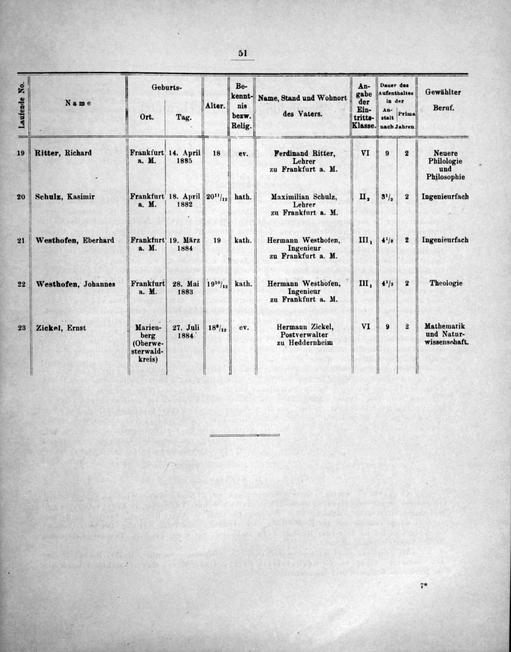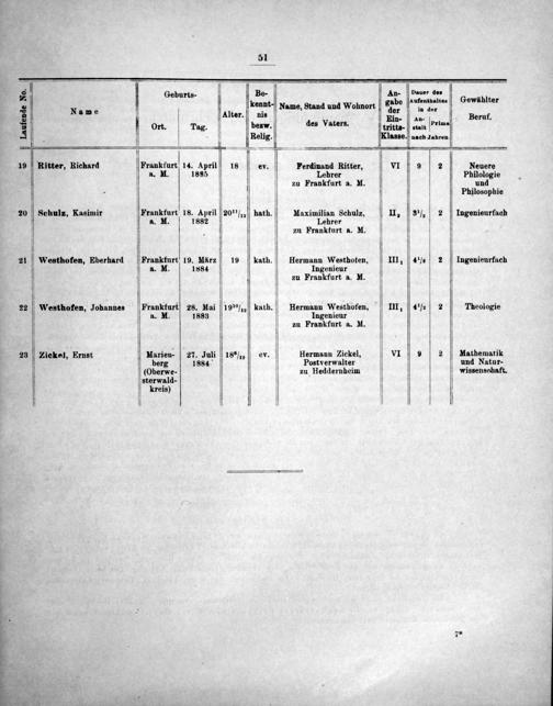 22 Westhofen, Johannes Frankturt 28. Mai 191%,] kath. Hermann Westhofen, III, 4 ½ 2 Theologie a. M. 1883 Ingenieur zu Frankfurt a. M. V b 23 Zickel, Ernst Marien- 27. Juli 18 ⁄2 ev. Hermann Zickel, VI9 2 Mathematik berg 1884 Postverwalter und Natur- (Oberwe- zu Heddernheim wissenschaft. sterwald- V kreis) V 1