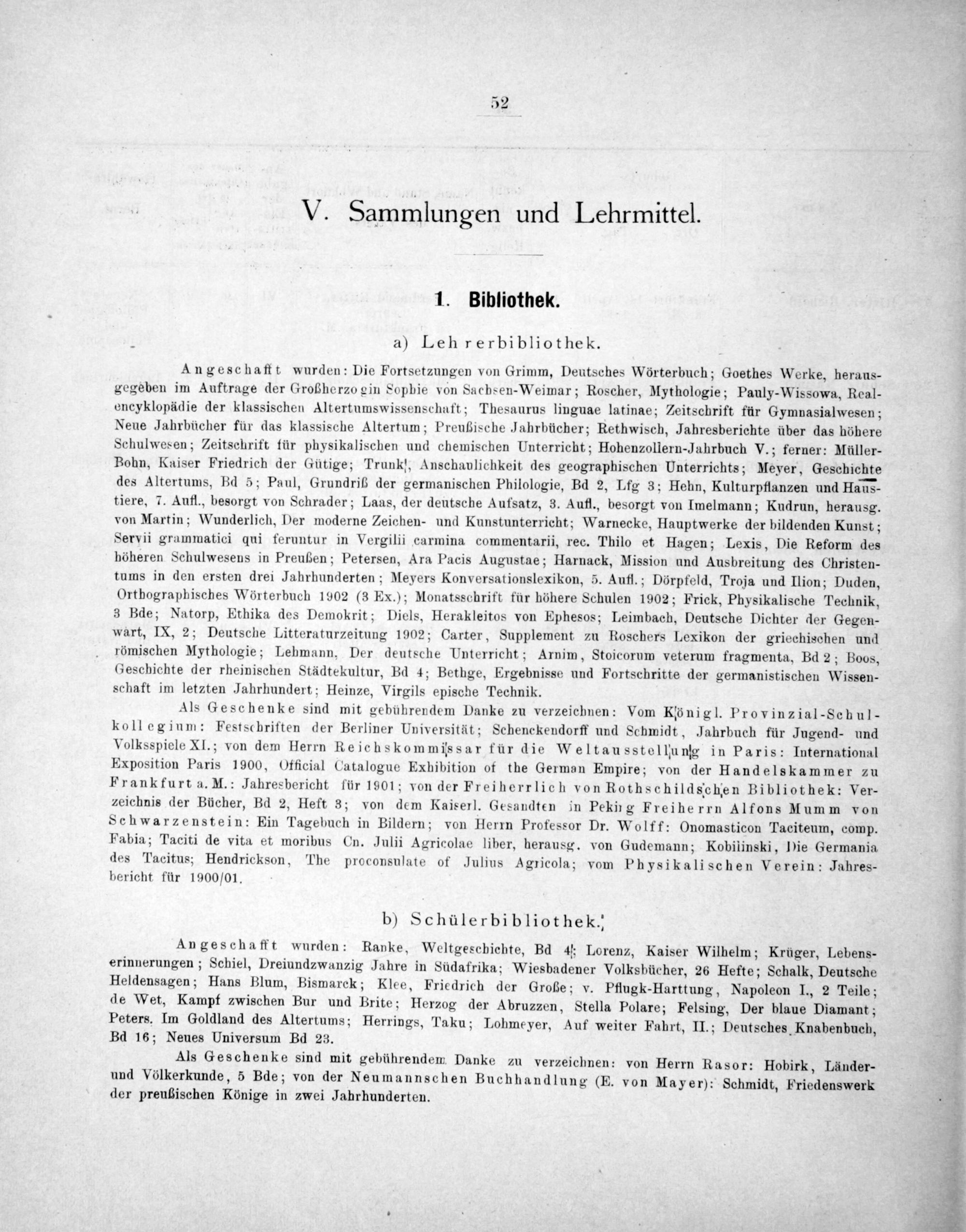 Angeschafft wurden: Die Fortsetzungen von Grimm, Deutsches Wörterbuch; Goethes Werke, heraus- gegeben im Auftrage der Großherzo gin Sopbie von Sachsen-Weimar; Roscher, Mythologie; Pauly-Wissowa, Real- encyklopädie der klassischen Altertumswissenschaft; Thesaurus linguae latinae; Zeitschrift für Gymnasialwesen; Neue Jahrbücher für das klassische Altertum; Preußische Jahrbücher; Rethwisch, Jahresberichte über das höbere Schulwesen; Zeitschrift für physikalischen und chemischen Unterricht; Hohenzollern-Jahrbuch V.; ferner: Müller- Bohn, Kniser Friedrich der Gütige; Trunk,, Anschaulichkeit des geographischen Unterrichts; Meyer, Geschichte des Altertums, Bd 5; Paul, Grundriß der germanischen Philologie, Bd 2, Lfg 3; Hehn, Kulturpflanzen und Hans- tiere, 7. Aufl., besorgt von Schrader; Laas, der deutsche Aufsatz, 3. Aufl., besorgt von Imelmann; Kudrun, herausg. von Martin; Wunderlich, Der moderne Zeichen- und Kunstunterricht; Warnecke, Hauptwerke der bildenden Kunst; Servii grammatici qui feruntur in Vergilii carmina commentarii, rec. Thilo et Hagen; Lexis, Die Reform des höheren Schulwesens in Preußen; Petersen, Ara Pacis Augustae; Harnack, Mission und Ausbreitung des Christen- tums in den ersten drei Jahrhunderten; Meyers Konversationslexikon, 5. Aufl.; Dörpfeld, Troja und Ilion; Duden, Orthographisches Wörterbuch 1902(3 Ex.); Monatsschrift für höhere Schulen 1902; Frick, Physikalische Technik, 3 Bde; Natorp, Ethika des Demokrit; Diels, Herakleitos von Ephesos; Leimbach, Deutsche Dichter der Gegen- wart, IX, 2; Deutsche Litteraturzeitung 1902; Carter, Supplement zu Roschers Lexikon der griechischen und römischen Mythologie; Lehmann, Der deutsche Unterricht; Arnim, Stoicorum veterum fragmenta, Bd 2; Boos, Geschichte der rheinischen Städtekultur, Bd 4; Bethge, Ergebnisse und Fortschritte der germanistischen Wissen- schaft im letzten Jahrhundert; Heinze, Virgils epische Technik.