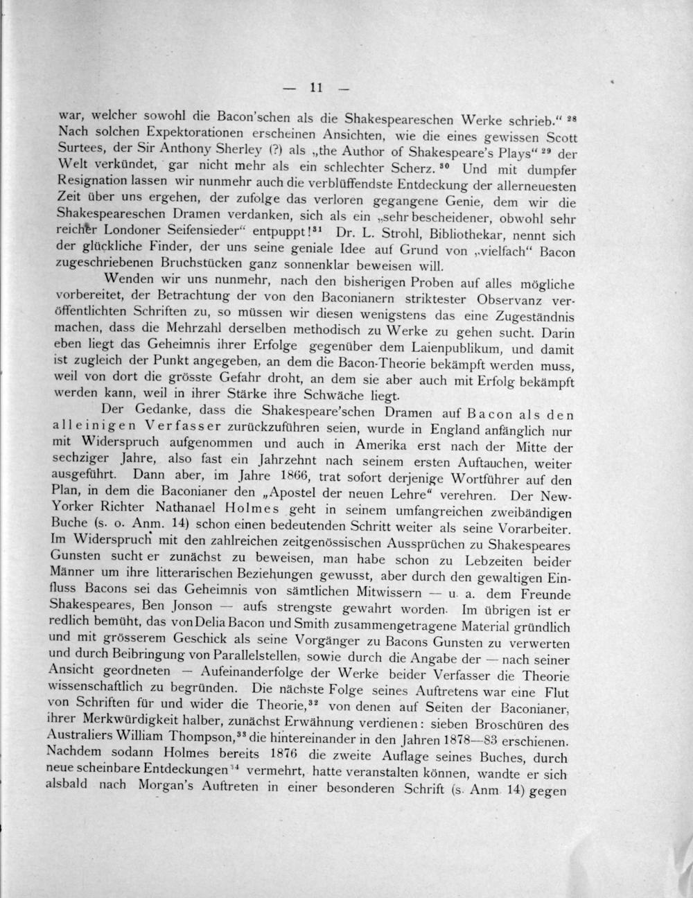 war, welcher sowohl die Bacon'schen als die Shakespeareschen Werke schrieb.“ ²s Nach solchen Expektorationen erscheinen Ansichten, wie die eines gewissen Scott Surtees, der Sir Anthony Sherley(?) als„the Author of Shakespeare's Plays“ ²9 der Welt verkündet, gar nicht mehr als ein schlechter Scherz. mUnd mit dumpfer Resignation lassen wir nunmehr auch die verblüffendste Entdeckung der allerneuesten Zeit über uns ergehen, der zufolge das verloren gegangene Genie, dem wir die Shakespeareschen Dramen verdanken, sich als ein„Sehr bescheidener, obwohl sehr reichèr Londoner Seifensieder“ entpuppt!³* Dr. L. Strohl, Bibliothekar, nennt sich der glückliche Finder, der uns seine geniale Ildee auf Grund von„vielfach“ Bacon zugeschriebenen Bruchstücken ganz sonnenklar beweisen will.