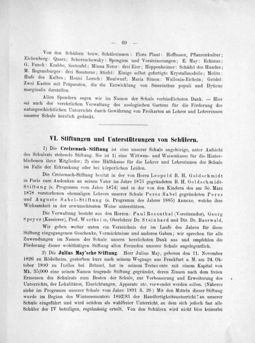 Die Creizenach-Stiftung besitzt in der von Herrn Leopold B. H. Goldschmidt in Paris zum Andenken an seinen Vater im Jahre 1873 gegründeten B. H. Goldschmidt- Stiftung(s. Programm vom Jahre 1874) und in der von den Kindern des am 30. März 1878 verstorbenen ehemaligen Lehrers unserer Schule Perez Sabel gegründeten Pere⸗z und Auguste Sabel-Stiftung(s. Programm des Jahres 1885) Annexe, welche ihre Wirksamkeit in der erwünschtesten Weise unterstützen.
