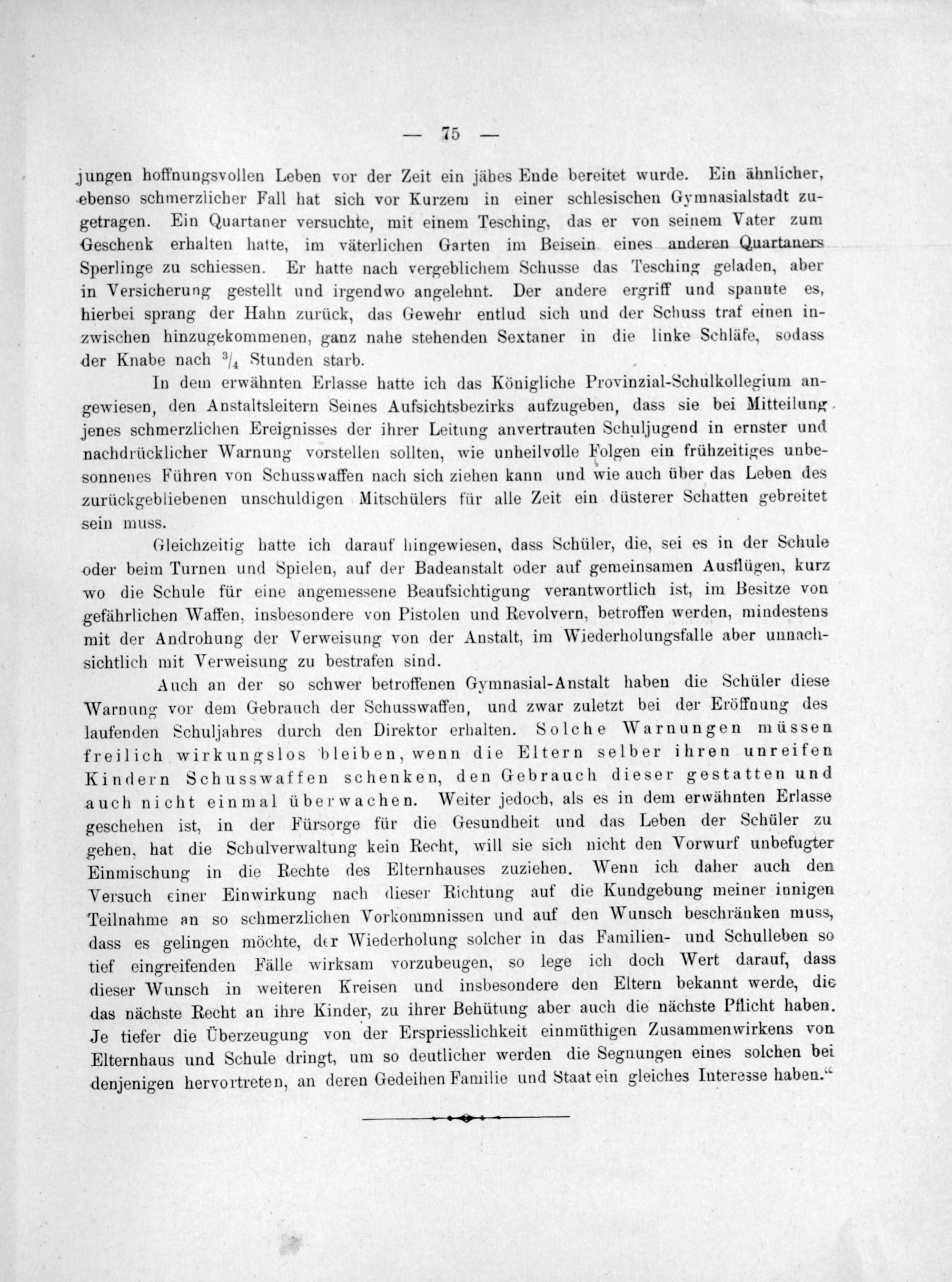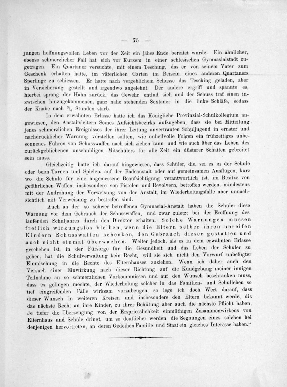 In dem erwähnten Erlasse hatte ich das Königliche Provinzial-Schulkollegium an- gewiesen, den Anstaltsleitern Seines Aufsichtsbezirks aufzugeben, dass sie bei Mitteilung jenes schmerzlichen Ereignisses der ihrer Leitung anvertrauten Schuljugend in ernster und nachdrücklicher Warnung vorstellen sollten, wie unheilvolle Folgen ein frühzeitiges unbe- sonnenes Führen von Schusswaffen nach sich ziehen kann und wie auch über das Leben des zurückgebliebenen unschuldigen Mitschülers für alle Zeit ein düsterer Schatten gebreitet sein muss.