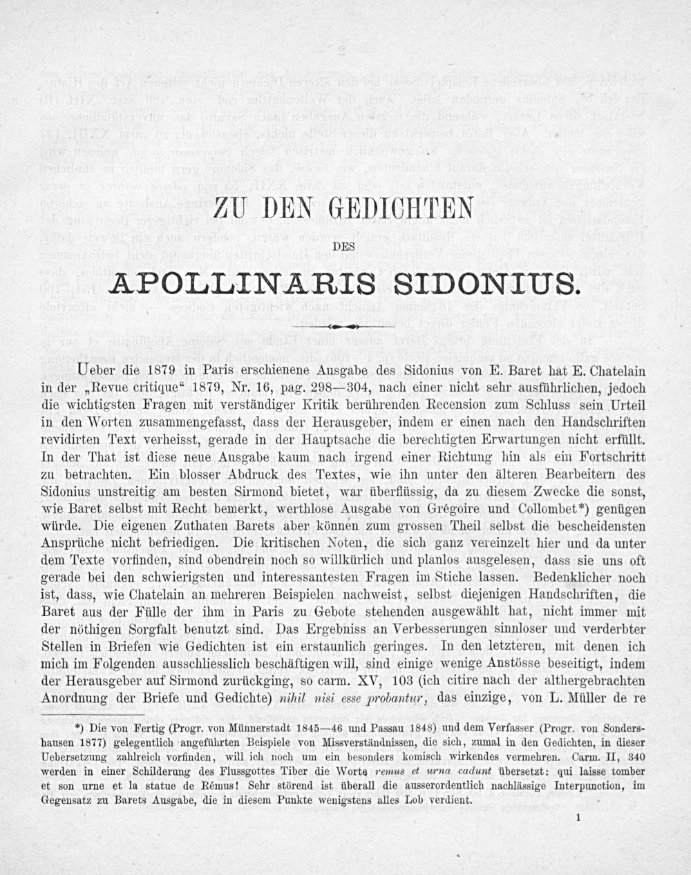 Ueber die 1879 in Paris erschienene Ausgabe des Sidonius von E. Baret hat E. Chatelain in der„Revue critique“ 1879, Nr. 16, pag. 298— 304, nach einer nicht sehr ausführlichen, jedoch die wichtigsten Fragen mit verständiger Kritik berührenden Recension zum Schluss sein Urteil in den Worten zusammengefasst, dass der Herausgeber, indem er einen nach den Handschriften revidirten Text verheisst, gerade in der Hauptsache die berechtigten Erwartungen nicht erfüllt. In der That ist diese neue Ausgabe kaum nach irgend einer Richtung hin als ein Fortschritt zu betrachten. Ein blosser Abdruck des Textes, wie ihn unter den älteren Bearbeitern des Sidonius unstreitig am besten Sirmond bietet, war überflüssig, da zu diesem Zwecke die sonst, wie Baret selbst mit Recht bemerkt, werthlose Ausgabe von Grégoire und Collombet*) genügen würde. Die eigenen Zuthaten Barets aber können zum grossen Theil selbst die bescheidensten Ansprüche nicht befriedigen. Die kritischen Noten, die sich ganz vereinzelt hier und da unter dem Texte vorfinden, sind obendrein noch so willkürlich und planlos ausgelesen, dass sie uns oft gerade bei den schwierigsten und interessantesten Fragen im Stiche lassen. Bedenklicher noch ist, dass, wie Chatelain an mehreren Beispielen nachweist, selbst diejenigen Handschriften, die Baret aus der Fülle der ihm in Paris zu Gebote stehenden ausgewählt hat, nicht immer mit der nöthigen Sorgfalt benutzt sind. Das Ergebniss an Verbesserungen sinnloser und verderbter Stellen in Briefen wie Gedichten ist ein erstaunlich geringes. In den letzteren, mit denen ich mich im Folgenden ausschliesslich beschäftigen will, sind einige wenige Anstösse beseitigt, indem der Herausgeber auf Sirmond zurückging, so carm. XV, 103(ich citire nach der althergebrachten Anordnung der Briefe und Gedichte) nihil nisi esse probantur, das einzige, von L. Müller de re