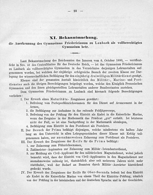 Laut Bekanntmachung des Reichsamtes des Inneren vom 6. October 1880,— veröffent- licht in Nro. 41 des Centralblattes für das Deutsche Reich,— ist das Gymnasium Friedericianum zu Laubach als vollberechtigtes Gymnasium in das Verzeichniss derjenigen Lehranstalten auf- genommen worden, bei welchen der einjährige erfolgreiche Besuch der zweiten Klasse zur Dar- legung der wissenschaftlichen Befähigung für den einjährig-freiwilligen Militärdienst genügt.