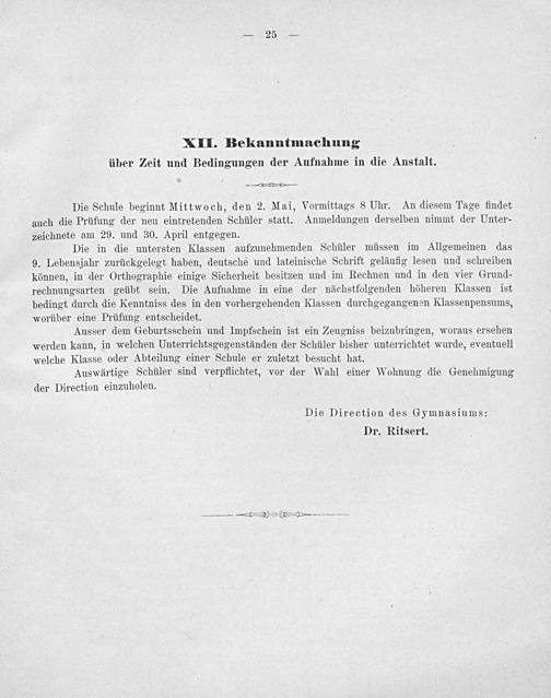 Die Direction des Gymnasiums: Dr. Ritsert.