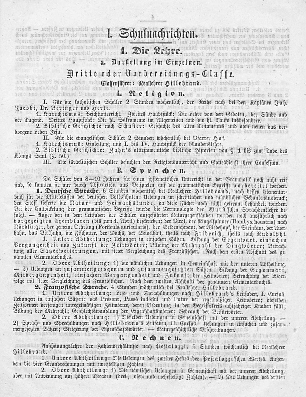 A. Neligion. 1 I. Für die katholiſchen Schüler 2 Stunden wöchentlich, der Reihe nach bei den Kaplänen Joh. Jacobi, Dr. Beringer und Herke. 1. Katechismus: Beichtunterricht. Zweites Hauptſtück: Die Lehre von den Geboten, der Sünde und der Tugend. Drittes Hauptſtück: Die hl. Sakramente im Allgemeinen und die hl. Taufe insbeſondere. 2. Bibliſche Geſchichte nach Schuſter: Geſchichte des alten Teſtamentes und vom neuen das ver⸗ borgene Leben Jeſu.. II. Für die evangeliſchen Schüler 2 Stunden wöchentlich bei Pfarrer Hof. 1. Katechismus: Einleitung und I. bis IV. Hauptſtück der Glaubenslehre. 2. Bibliſche Geſchichte: Zahn'’s altteſtamentliche bibliſche Hiſtorien von§. 1 bis zum Tode des Königs Saul(§. 50.) III. Die israelitiſchen Schüler beſuchten den Religionsunterricht und Gottesdienſt ihrer Confeſſion. B. Sprachen.