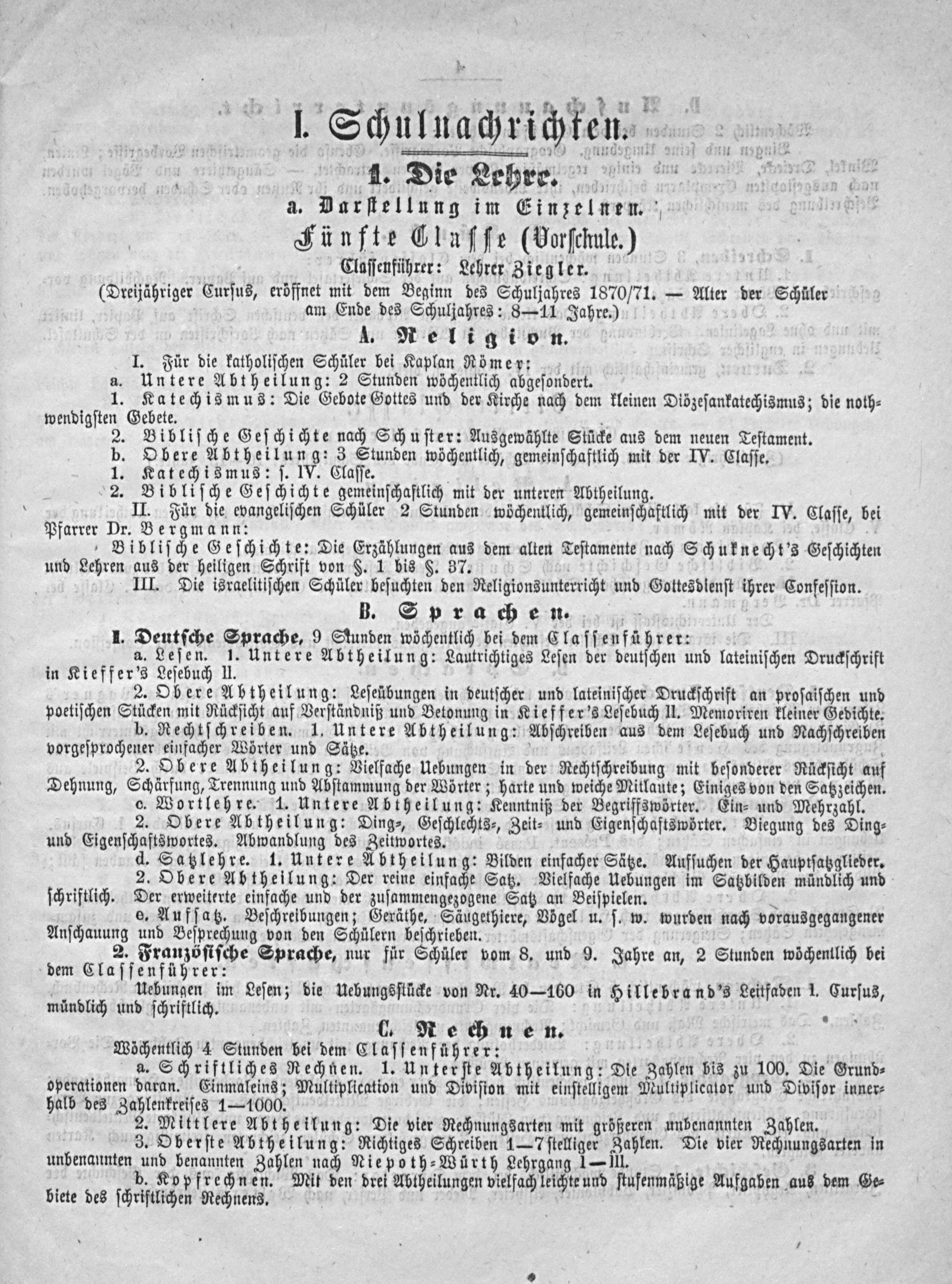 (Dreijähriger Curſus, eröffnet mit dem Beginn des Schuljahres 1870/71.— Alter der Schüler am Ende des Schuljahres: 8— 11 Jahre.) A. Neligion. I. Für die katholiſchen Schüler bei Kaplan Römer: a. Untere Abtheilung: 2 Stunden wöchentlich abgeſondert. 1. Katechismus: Die Gebote Gottes und der Kirche nach dem kleinen Diözeſankatechismus; die noth⸗ wendigſten Gebete.. 2. Bibliſche Geſchichte nach Schuſter: Ausgewählte Stücke aus dem neuen Teſtament. b. Obere Abtheilung: 3 Stunden wöchentlich, gemeinſchaftlich mit der IV. Claſſe. 1. Katechismus: ſ. IV. Claſſe. 2. Bibliſche Geſchichte gemeinſchaftlich mit der unteren Abtheilung. II. Für die evangeliſchen Schüler 2 Stunden wöchentlich, gemeinſchaftlich mit der IV. Claſſe, bei Pfarrer Dr. Bergmann: „Bibliſche Geſchichte: Die Erzählungen aus dem alten Teſtamente nach Schuknecht's Geſchichten und Lehren aus der heiligen Schrift von§. 1 bis§. 37. III. Die israelitiſchen Schüler beſuchten den Religionsunterricht und Gottesdienſt ihrer Confeſſion.
