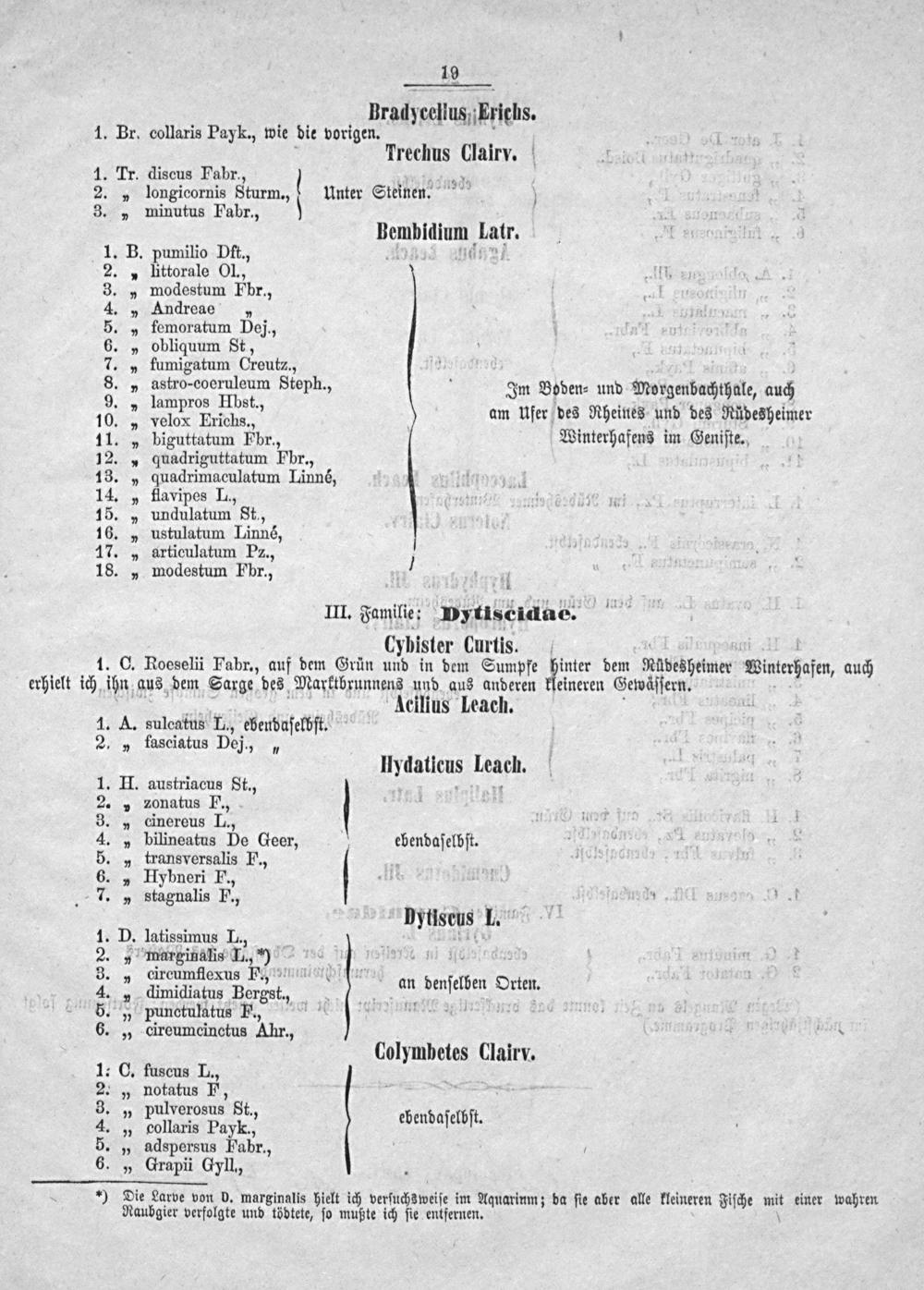 Cybister Curtis.. 1 1. C. Roeselii Fabr., auf dem Grün und in dem Sumpfe hnten dem Rüdesheimer Winterhafen, auch erhielt ich ihn aus dem Sarge des Marktbrunnens und aus anderen kleineren Gewäſſern. Acilius Leach. 1. A. sulcatus L., ebendaſelbſt.