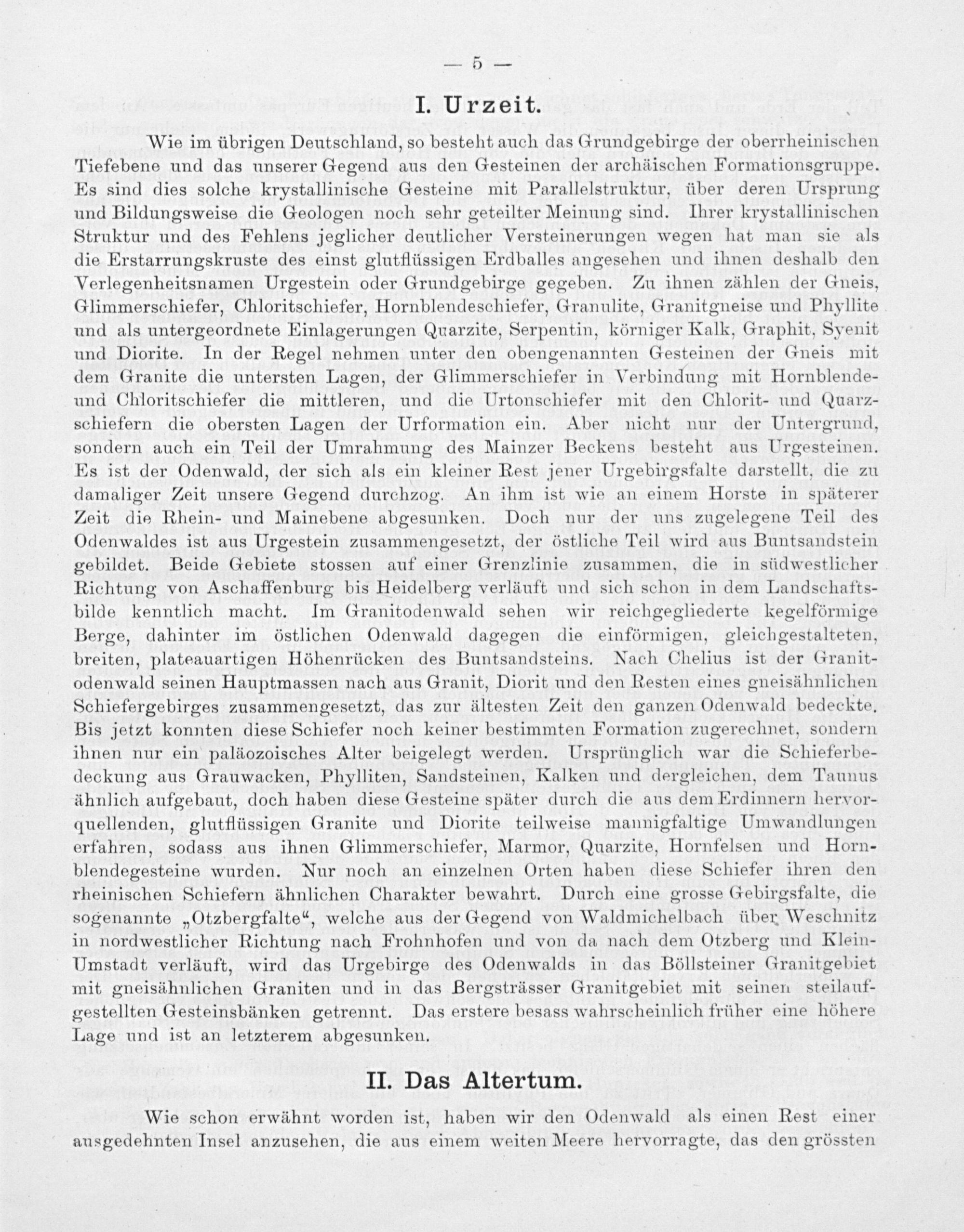 Wie im übrigen Deutschland, so besteht auch das Grundgebirge der oberrheinischen Tiefebene und das unserer Gegend aus den Gesteinen der archäischen Formationsgruppe. Es sind dies solche krystallinische Gesteine mit Parallelstruktur, über deren Ursprung und Bildungsweise die Geologen noch sehr geteilter Meinung sind. Ihrer krystallinischen Struktur und des Fehlens jeglicher deutlicher Versteinerungen wegen hat man sie als die Erstarrungskruste des einst glutflüssigen Erdballes angesehen und ihnen deshalb den Verlegenheitsnamen Urgestein oder Grundgebirge gegeben. Zu ihnen zählen der Gneis, Glimmerschiefer, Chloritschiefer, Hornblendeschiefer, Granulite, Granitgneise und Phyllite und als untergeordnete Einlagerungen Quarzite, Serpentin, körniger Kalk, Graphit, Syenit und Diorite. In der Regel nehmen unter den obengenannten Gesteinen der Gneis mit dem Granite die untersten Lagen, der Glimmerschiefer in Verbindung mit Hornblende- und Chloritschiefer die mittleren, und die Urtonschiefer mit den Chlorit- und Quarz- schiefern die obersten Lagen der Urformation ein. Aber nicht nur der Untergrund, sondern auch ein Teil der Umrahmung des Mainzer Beckens besteht aus Urgesteinen. Es ist der Odenwald, der sich als ein kleiner Rest jener Urgebirgsfalte darstellt, die zu damaliger Zeit unsere Gegend durchzog. An ihm ist wie an einem Horste in späterer Zeit die Rhein- und Mainebene abgesunken. Doch nur der uns zugelegene Teil des ÖOdenwaldes ist aus Urgestein zusammengesetzt, der östliche Teil wird aus Buntsandstein gebildet. Beide Gebiete stossen auf einer Grenziinie zusammen, die in südwestlicher Richtung von Aschaffenburg bis Heidelberg verläuft und sich schon in dem Landschatts- bilde kenntlich macht. Im Granitodenwald sehen wir reichgegliederte kegelförmige Berge, dahinter im östlichen Odenwald dagegen die einförmigen, gleichgestalteten, breiten, plateauartigen Höhenrücken des Buntsandsteins. Nach Chelius ist der Granit- odenwald seinen Hauptmassen nach aus Granit, Diorit und den Resten eines gneisähnlichen Schiefergebirges zusammengesetzt, das zur ältesten Zeit den ganzen Odenwald bedeckte, Bis jetzt konnten diese Schiefer noch keiner bestimmten Formation zugerechnet, sondern ihnen nur ein paläozoisches Alter beigelegt werden. Ursprünglich war die Schieferbe- deckung aus Grauwacken, Phylliten, Sandsteinen, Kalken und dergleichen, dem Taunus ähnlich aufgebaut, doch haben diese Gesteine später durch die aus dem Erdinnern hervor- quellenden, glutflüssigen Granite und Diorite teilweise mannigfaltige Umwandlungen erfahren, sodass aus ihnen Glimmerschiefer, Marmor, Quarzite, Hornfelsen und Horn- blendegesteine wurden. Nur noch an einzelnen Orten haben diese Schiefer ihren den rheinischen Schiefern ähnlichen Charakter bewahrt. Durch eine grosse(rebirgsfalte, die sogenannte„Otzbergfalte“, welche aus der Gegend von Waldmichelbach über Weschnitz in nordwestlicher Richtung nach Frohnhofen und von da nach dem Otzberg und Klein- Umstadt verläuft, wird das Urgebirge des Odenwalds in das Böllsteiner Granitgebiet mit gneisähnlichen Graniten und in das Bergsträsser Granitgebiet mit seinen steilauf- gestellten Gesteinsbänken getrennt. Das erstere besass wahrscheinlich früher eine höhere Lage und ist an letzterem abgesunken,