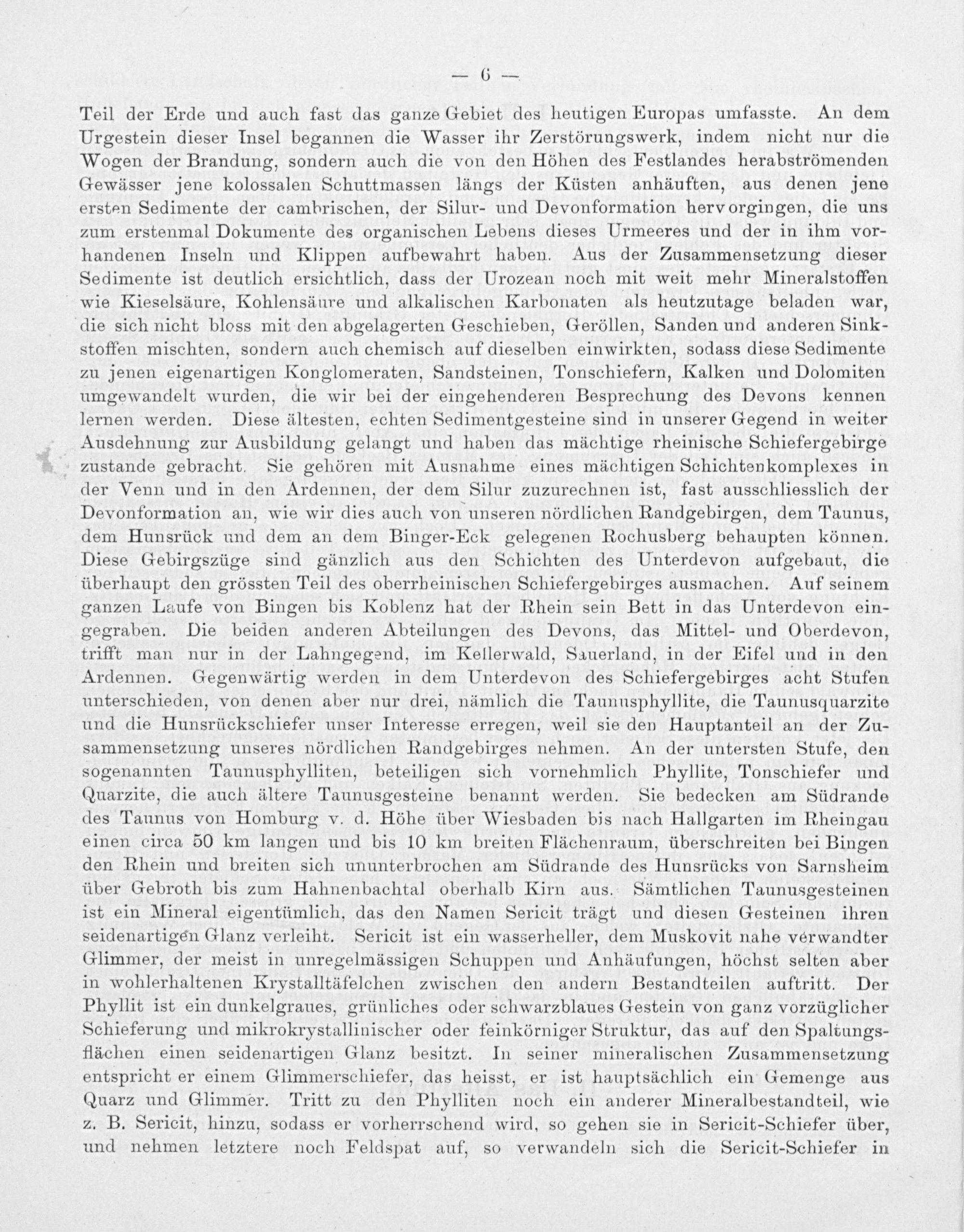 Teil der Erde und auch fast das ganze Gebiet des heutigen Europas umfasste. An dem Urgestein dieser Insel begannen die Wasser ihr Zerstörungswerk, indem nicht nur die Wogen der Brandung, sondern auch die von den Höhen des Festlandes herabströmenden Gewässer jene kolossalen Schuttmassen längs der Küsten anhäuften, aus denen jene ersten Sedimente der camhrischen, der Silur- und Devonformation hervorgingen, die uns zum erstenmal Dokumente des organischen Lebens dieses Urmeeres und der in ihm vor- handenen Inseln und Klippen aufbewahrt haben. Aus der Zusammensetzung dieser Sedimente ist deutlich ersichtlich, dass der Urozean noch mit weit mehr Mineralstoffen wie Kieselsäure, Kohlensäure und alkalischen Karbonaten als heutzutage beladen war, ‚die sich nicht bloss mit den abgelagerten Geschieben, Geröllen, Sanden und anderen Sink- stoffen mischten, sondern auch chemisch auf dieselben einwirkten, sodass diese Sedimente zu jenen eigenartigen Konglomeraten, Sandsteinen, Tonschiefern, Kalken und Dolomiten umgewandelt wurden, die wir bei der eingehenderen Besprechung des Devons kennen lernen werden. Diese ältesten, echten Sedimentgesteine sind in unserer fegend in weiter Ausdehnung zur Ausbildung gelangt und haben das mächtige rheinische Schiefergebirge zustande gebracht. Sie gehören mit Ausnahme eines mächtigen Schichtenkomplexes in der Venn und in den Ardennen, der dem Silur zuzurechnen ist, fast ausschliesslich der Devonformation an, wie wir dies auch von unseren nördlichen Randgebirgen, dem Taunus, dem Hunsrück und dem an dem Binger-Eck gelegenen Rochusberg behaupten können. Diese Gebirgszüge sind gänzlich aus den Schichten des Unterdevon aufgebaut, die überhaupt den grössten Teil des oberrheinischen Schiefergebirges ausmachen. Auf seinem ganzen Laufe von Bingen bis Koblenz hat der Rhein sein Bett in das Unterdevon ein- gegraben. Die beiden anderen Abteilungen des Devons, das Mittel- und Oberdevon, trifft man nur in der Lahngegend, im Kellerwald, Sauerland, in der Eifel und in den Ardennen. Gegenwärtig werden in dem Unterdevon des Schiefergebirges acht Stufen unterschieden, von denen aber nur drei, nämlich die Taunusphyllite, die Taunusquarzite und die Hunsrückschiefer unser Interesse erregen, weil sie den Hauptanteil an der Zu- sammensetzung unseres nördlichen Randgebirges nehmen. An der untersten Stufe, den sogenannten Taunusphylliten, beteiligen sich vornehmlich Phyllite, Tonschiefer und Quarzite, die auch ältere Taunusgesteine benannt werden. Sie bedecken am Südrande des Taunus von Homburg v. d. Höhe über Wiesbaden bis nach Hallgarten im Rheingau einen circa 50 km langen und bis 10 km breiten Flächenraum, überschreiten bei Bingen den Rhein und breiten sich ununterbrochen am Südrande des Hunsrücks von Sarnsheim über Gebroth bis zum Hahnenbachtal oberhalb Kirn aus. Sümtlichen Taunusgesteinen ist ein Mineral eigentümlich, das den Namen Sericit trägt und diesen Gesteinen ihren seidenartigen Glanz verleiht. Sericit ist ein wasserheller, dem Muskovit nahe verwandter Glimmer, der meist in unregelmässigen Schuppen und Anhäufungen, höchst selten aber in wohlerhaltenen Krystalltäfelchen zwischen den andern Bestandteilen auftritt. Der Phyllit ist ein dunkelgraues, grünliches oder schwarzblaues Gestein von ganz vorzüglicher Schieferung und mikrokrystallinischer oder feinkörniger Struktur, das auf den Spalöungs- flächen einen seidenartigen Glanz besitzt. In seiner mineralischen Zusammensetzung entspricht er einem Glimmerschiefer, das heisst, er ist hauptsächlich ein Gemenge aus Quarz und Glimmer. Tritt zu den Phylliten noch ein anderer Mineralbestandteil, wie z. B. Sericit, hinzu, sodass er vorherrschend wird, so gehen sie in Serieit-Schiefer über, und nehmen letztere noch Feldspat auf, so verwandeln sich die Sericit-Schiefer in