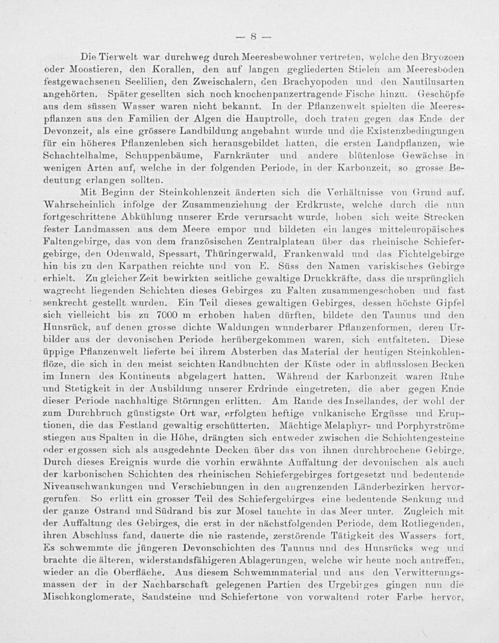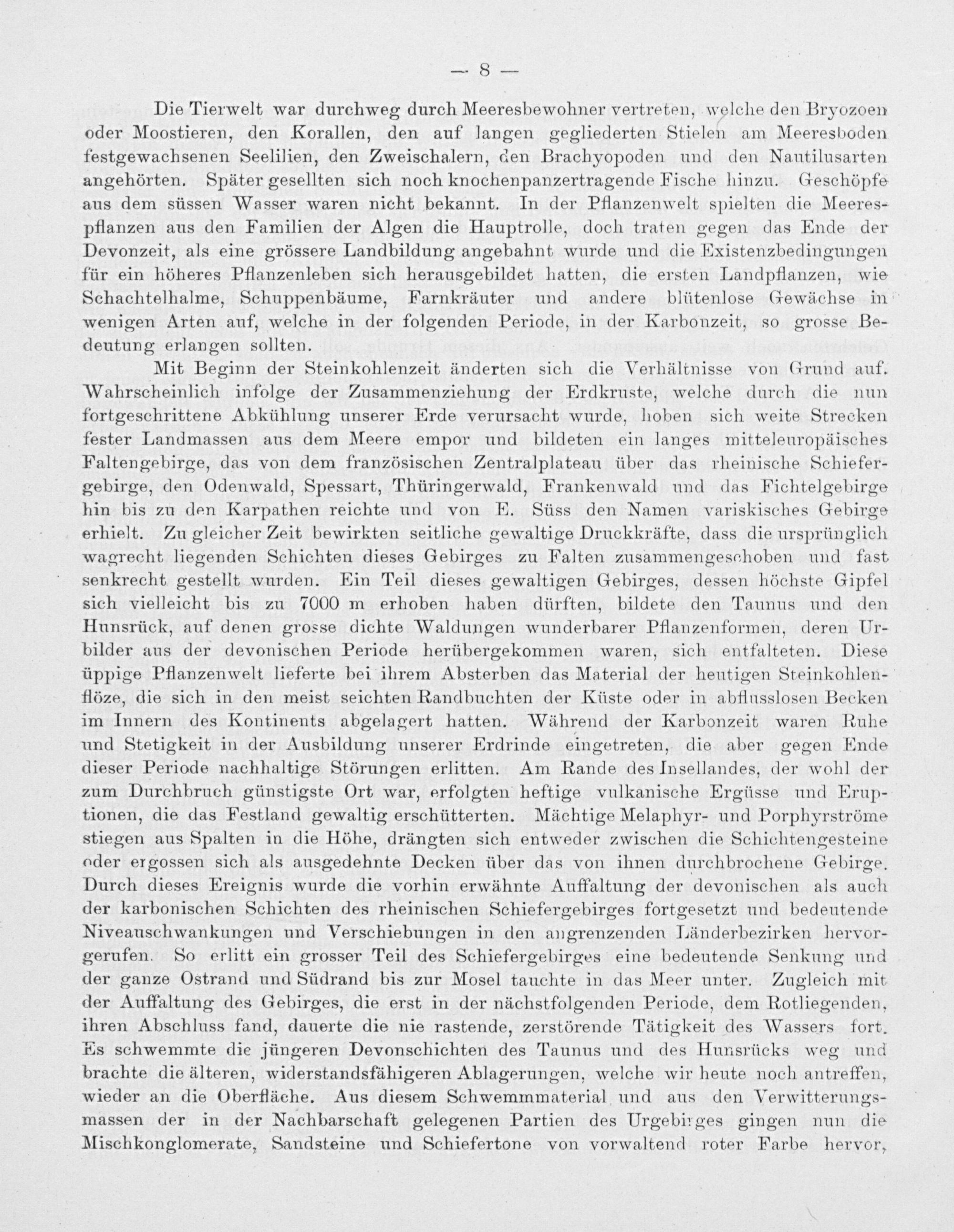 Mit Beginn der Steinkohlenzeit änderten sich die Verhältnisse von Grund auf. Wahrscheinlich infolge der Zusammenziehung der Erdkruste, welche durch die nun fortgeschrittene Abkühlung unserer Erde verursacht wurde, hoben sich weite Strecken fester Landmassen aus dem Meere empor und bildeten ein langes mitteleuropäisches Faltengebirge, das von dem französischen Zentralplateau über das rheinische Schiefer- gebirge, den Odenwald, Spessart, Thüringerwald, Frankenwald und das Fichtelgebirge hin bis zu den Karpathen reichte und von E. Süss den Namen variskisches Gebirge erhielt. Zu gleicher Zeit bewirkten seitliche gewaltige Druckkräfte, dass die ursprünglich wagrecht liegenden Schichten dieses Gebirges zu Falten zusammengeschoben und fast senkrecht gestellt wurden. Ein Teil dieses gewaltigen Gebirges, dessen höchste Gipfel sich vielleicht bis zu 7000 m erhoben haben dürften, bildete den Taunus und den Hunsrück, auf denen grosse dichte Waldungen wunderbarer Pflanzenformen, deren Ur- bilder aus der devonischen Periode herübergekommen waren, sich entfalteten. Diese üppige Pflanzenwelt lieferte bei ihrem Absterben das Material der heutigen Steinkohlen- flöze, die sich in den meist seichten Randbuchten der Küste oder in abflusslosen Becken im Innern des Kontinents abgelagert hatten. Während der Karbonzeit waren Ruhe und Stetigkeit in der Ausbildung unserer Erdrinde eingetreten, die aber gegen Finde dieser Periode nachhaltige Störungen erlitten. Am Rande des Insellandes, der wohl der zum Durchbruch günstigste Ort war, erfolgten heftige vulkanische Ergüsse und Erup- tionen, die das Festland gewaltig erschütterten. Mächtige Melaphyr- und Porphyrströme stiegen aus Spalten in die Höhe, drängten sich entweder zwischen die Schichtengesteine oder ergossen sich als ausgedehnte Decken über das von ihnen durchbrochene Gebirge, Durch dieses Ereignis wurde die vorhin erwähnte Auffaltung der devonischen als auch der karbonischen Schichten des rheinischen Schiefergebirges fortgesetzt und bedeutende Niveauschwankungen und Verschiebungen in den angrenzenden Länderbezirken hervor- gerufen. So erlitt ein grosser Teil des Schiefergebirges eine bedeutende Senkung und der ganze Ostrand und Südrand bis zur Mosel tauchte in das Meer unter. Zugleich mit der Auffaltung des Gebirges, die erst in der nächstfolgenden Periode, dem Rotliegenden, ihren Abschluss fand, dauerte die nie rastende, zerstörende Tätigkeit des Wassers fort. Es schwemmte die jüngeren Devonschichten des Taunus und des Hunsrücks weg und brachte die älteren, widerstandsfähigeren Ablagerungen, welche wir heute noch antreffen, wieder an die Oberfläche. Aus diesem Schwemmmaterial und aus den Verwitterungs- massen der in der Nachbarschaft gelegenen Partien des Urgebirges gingen nun die Mischkonglomerate, Sandsteine und Schiefertone von vorwaltend roter Farbe hervor,