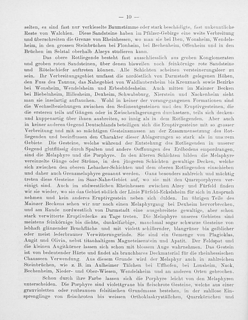 selten, es sind fast nur verkieselte Baumstämme oder stark beschädigte, fast unkenntliche Reste von Walchien. Diese Sandsteine haben im Pfälzer-Gebirge eine weite Verbreitung und überschreiten die Grenze von Rheinhessen, wo man sie bei Iben, Wonsheim, Wendels- heim, in den grossen Steinbrüchen bei Flonheim, bei Bechenheim, Oftenheim und in den Brüchen im Selztal oberhalb Alzeys studieren kann.