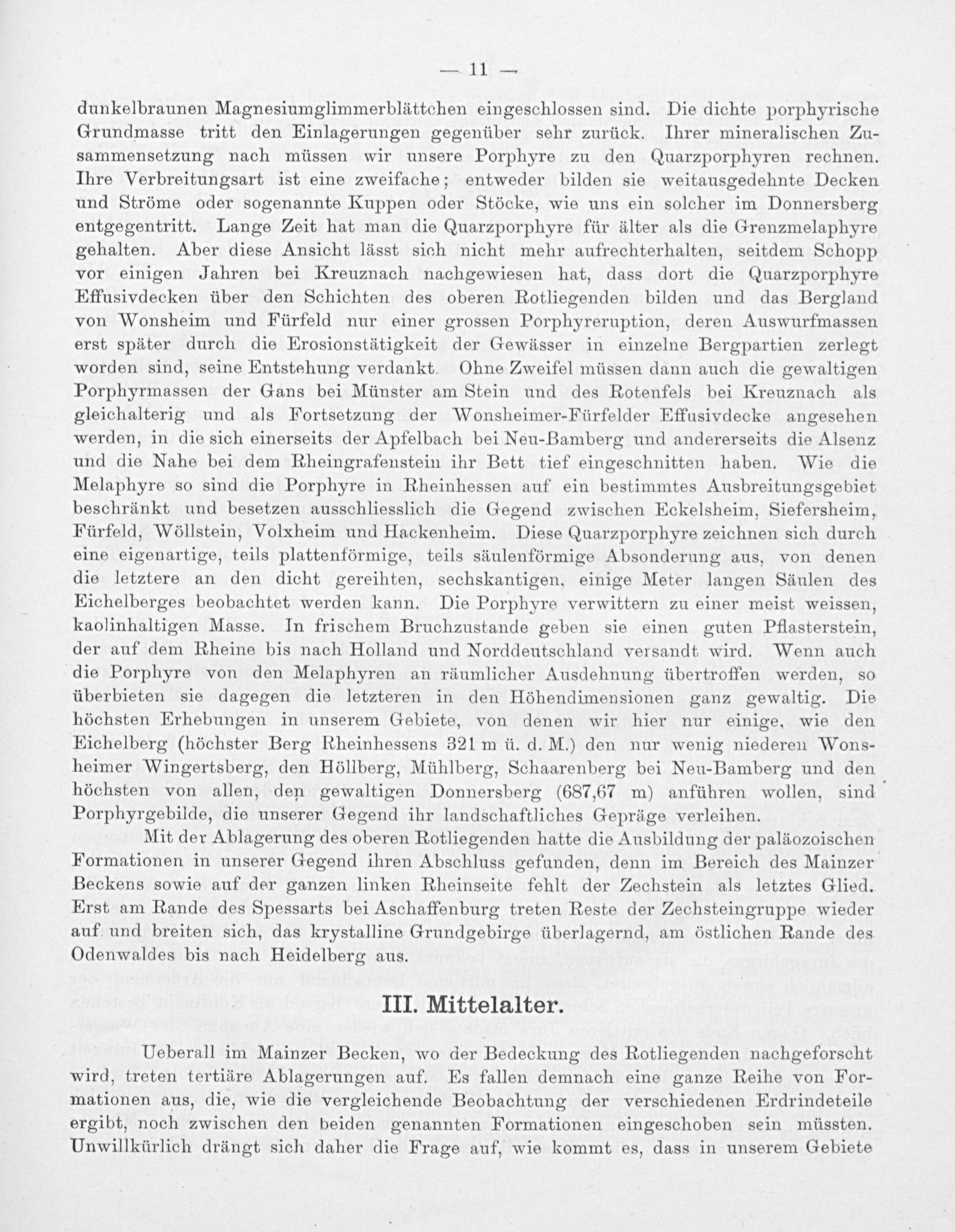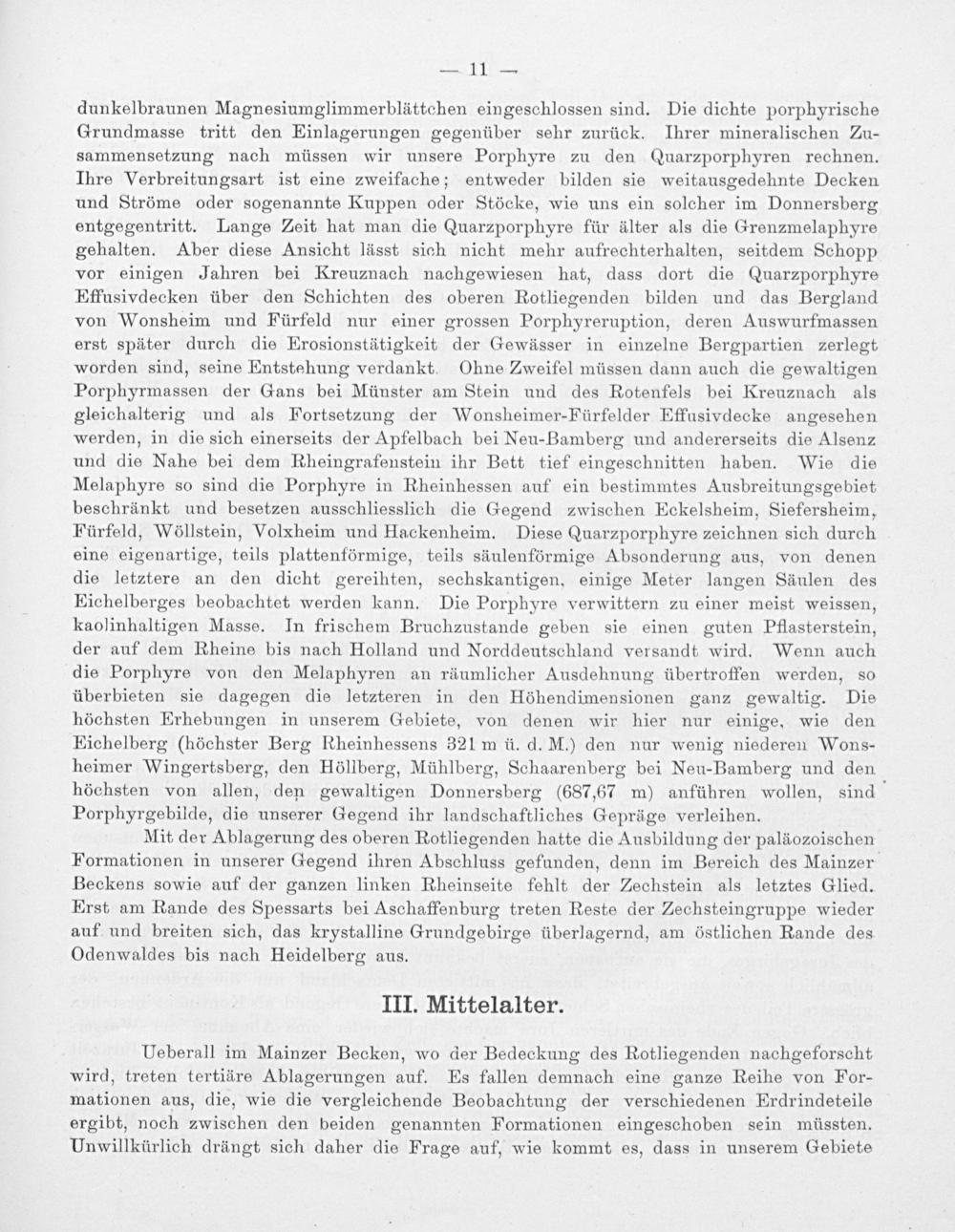 dunkelbraunen Magnesiumglimmerblättchen eingeschlossen sind. Die dichte porphyrische Grundmasse tritt den Einlagerungen gegenüber sehr zurück. Ihrer mineralischen Zu- sammensetzung nach müssen wir unsere Porphyre zu den Quarzporphyren rechnen. Ihre Verbreitungsart ist eine zweifache; entweder bilden sie weitausgedehnte Decken und Ströme oder sogenannte Kuppen oder Stöcke, wie uns ein solcher im Donnersberg entgegentritt. Lange Zeit hat man die Quarzporphyre für älter als die Grenzmelaphyre gehalten. Aber diese Ansicht lässt sich nicht mehr aufrechterhalten, seitdem Schopp vor einigen Jahren bei Kreuznach nachgewiesen hat, dass dort die Quarzporphyre Effusivdecken über den Schichten des oberen Rotliegenden bilden und das Bergland von Wonsheim und Fürfeld nur einer grossen Porphyreruption, deren Auswurfmassen erst später durch die Erosionstätigkeit der Gewässer in einzelne Bergpartien zerlegt worden sind, seine Entstehung verdankt. Ohne Zweifel müssen dann auch die gewaltigen Porphyrmassen der Gans bei Münster am Stein und des Rotenfels bei Kreuznach als gleichalterig und als Fortsetzung der Wonsheimer-Fürfelder Effusivdecke angesehen werden, in die sich einerseits der Apfelbach bei Neu-Bamberg und andererseits die Alsenz und die Nahe bei dem Rheingrafenstein ihr Bett tief eingeschnitten haben. Wie die Melaphyre so sind die Porphyre in Rheinhessen auf ein bestimmtes Ausbreitungsgebiet beschränkt und besetzen ausschliesslich die Gegend zwischen Eckelsheim, Siefersheim, Fürfeld, Wöllstein, Volxheim und Hackenheim. Diese Quarzporphyre zeichnen sich durch eine eigenartige, teils plattenförmige, teils säulenförmige Absonderung aus, von denen die letztere an den dicht gereihten, sechskantigen, einige Meter langen Säulen des Eichelberges beobachtet werden kann. Die Porphyre verwittern zu einer meist weissen, kaolinhaltigen Masse. In frischem Bruchzustande geben sie einen guten Pflasterstein, der auf dem Rheine bis nach Holland und Norddeutschland versandt wird. Wenn auch die Porphyre von den Melaphyren an räumlicher Ausdehnung übertroffen werden, so überbieten sie dagegen die letzteren in den Höhendimensionen ganz gewaltig. Die höchsten Erhebungen in unserem Gebiete, von denen wir hier nur einige, wie den Eichelberg(höchster Berg Rheinhessens 321m ü. d.M.) den nur wenig niederen Wons- heimer Wingertsberg, den Höllberg, Mühlberg, Schaarenberg bei Neu-Bamberg und den höchsten von allen, den gewaltigen Donnersberg(687,67 m) anführen wollen, sind Porphyrgebilde, die unserer Gegend ihr landschaftliches Gepräge verleihen.