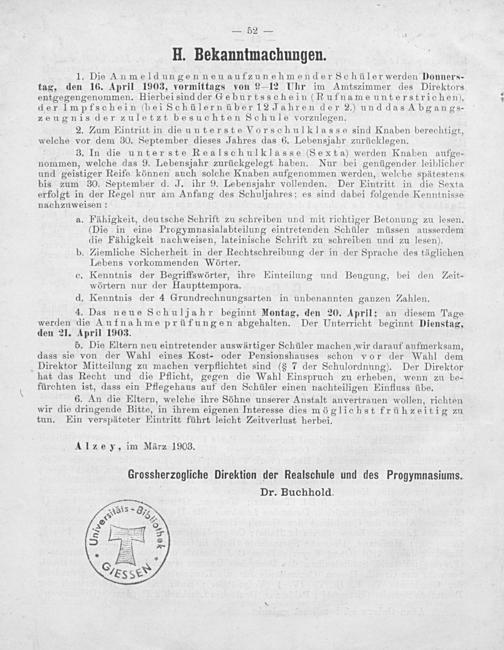1. Do Anmeldungenneuaufzunehmender Schüler werden Donners- tag, den 16. April 1903, vormittags von 9—I2 Uhr im Amtszimmer des Direktors entgegengenommen, Hierbei sind derG&eburtsschein(Rufnameunterstrichen), deriImpfschein(beiSchülernüber12 Jahren der 2.) unddas Abgangs zeugnisder zuletzt besuchten Schule vorzulegen.