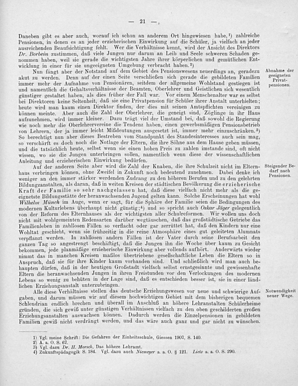 Daneben gibt es aber auch, worauf ich schon an anderem Ort hingewiesen habe, ¹) zahlreiche Pensionen, in denen es an jeder erzieherischen Einwirkung auf die Schüler, ja vielfach an jeder ausreichenden Beaufsichtigung fehlt. Wer die Verhältnisse kennt, wird der Ansicht des Direktors Dr. Borbein zustimmen, daß viele Jungen nur darum an Leib und Seele schweren Schaden ge- nommen haben, weil sie gerade die wichtigsten Jahre ihrer körperlichen und gemütlichen Ent- wicklung in einer für sie ungeeigneten Umgebung verbracht haben. ²)