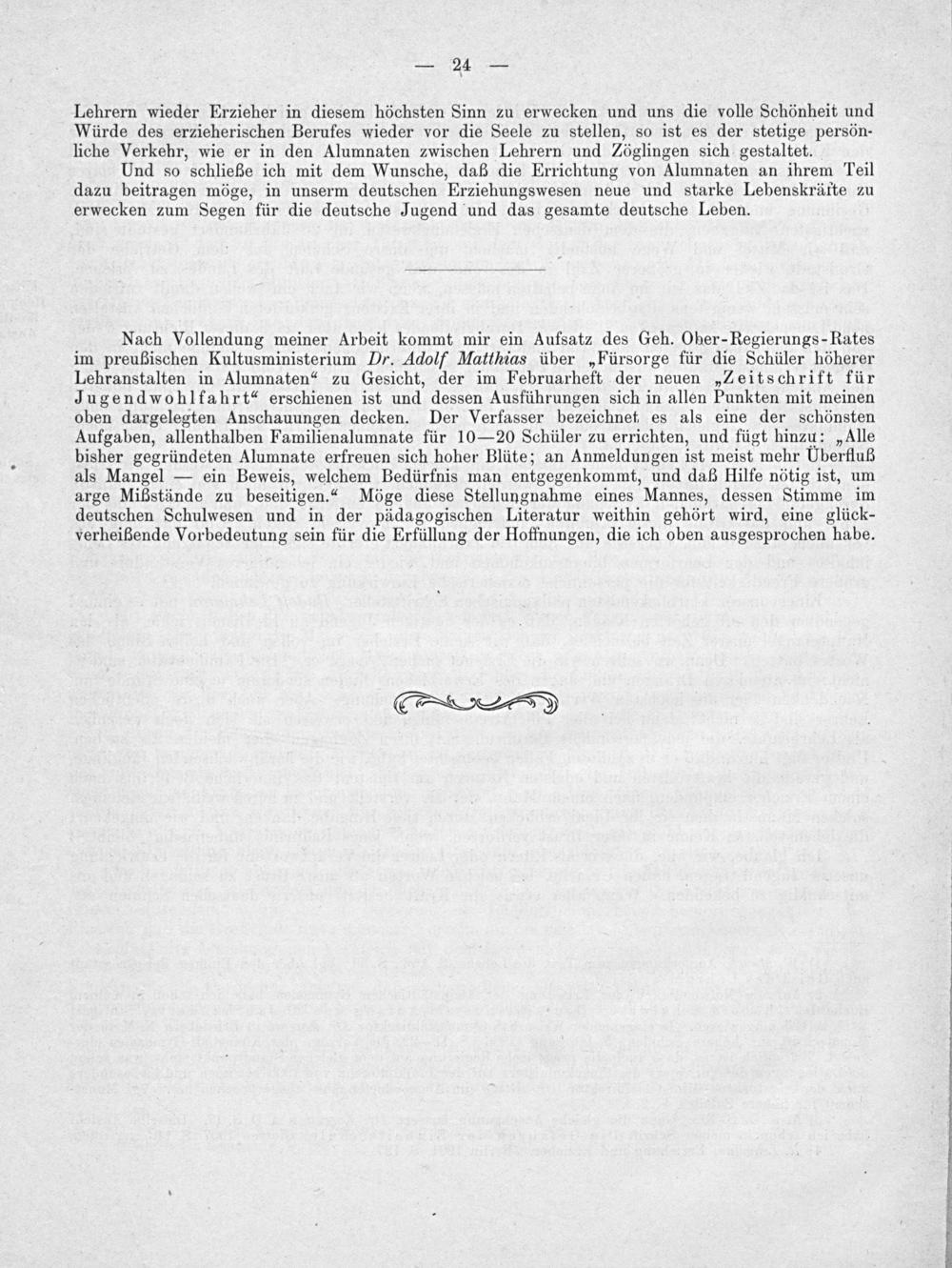 Und so schließe ich mit dem Wunsche, daß die Errichtung von Alumnaten an ihrem Teil dazu beitragen möge, in unserm deutschen Erziehungswesen neue und starke Lebenskräfte zu erwecken zum Segen für die deutsche Jugend und das gesamte deutsche Leben.