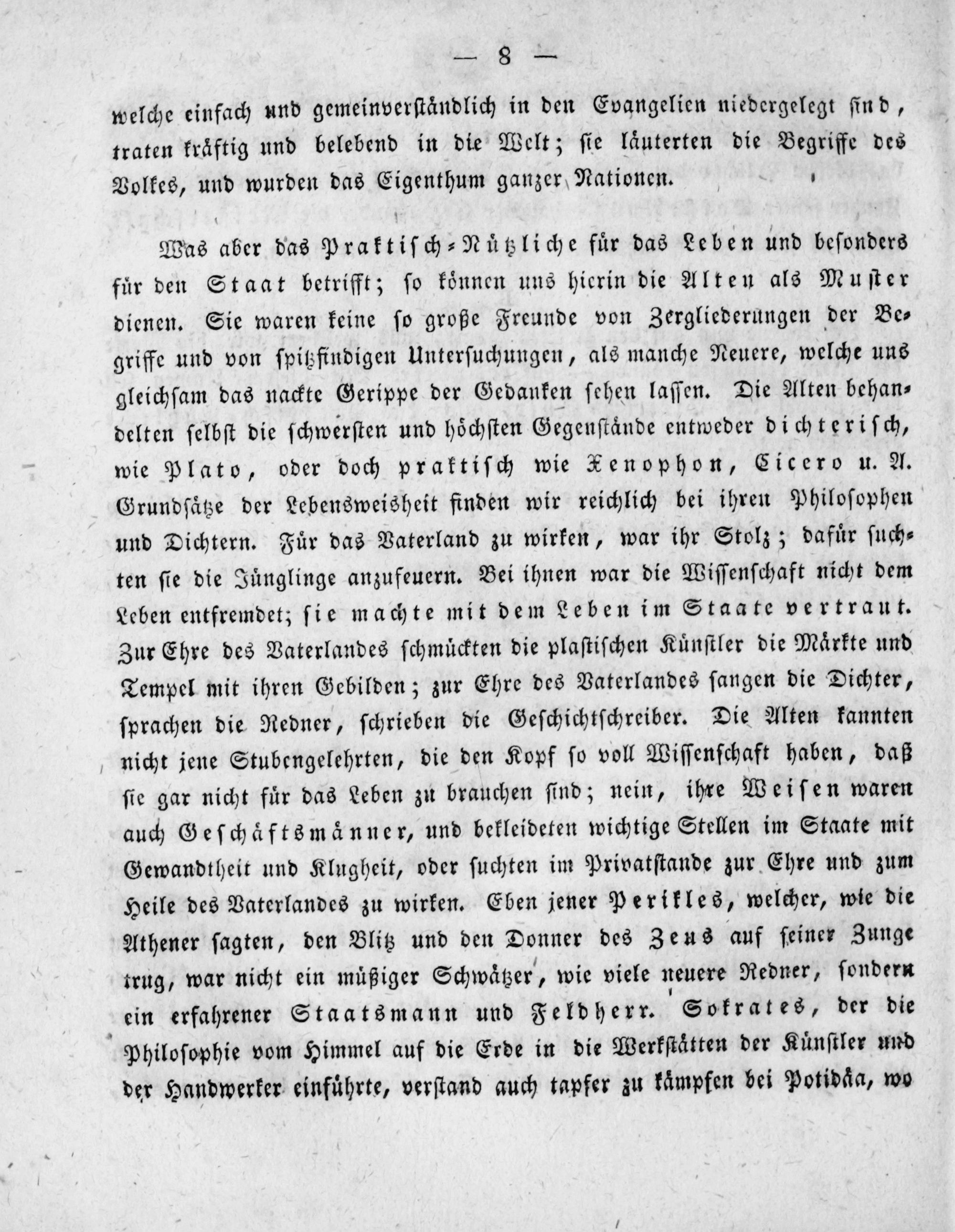 Was aber das Praktiſch⸗Nuͤtzliche fuͤr das Leben und beſonders fuͤr den Staat betrifft; ſo koͤnnen uns hierin die Alten als Muſter dienen. Sie waren keine ſo große Freunde von Zergliederungen der Be⸗ griffe und von ſpitzfindigen Unterſuchungen, als manche Neuere, welche uns gleichſam das nackte Gerippe der Gedanken ſehen laſſen. Die Alten behan⸗ delten ſelbſt die ſchwerſten und hoͤchſten Gegenſtaͤnde entweder dichteriſch, wie Plato, oder doch praktiſch wie Fenophon, Cicero u. A. Grundſaͤtze der Lebensweisheit finden wir reichlich bei ihren Philoſophen und Dichtern. Fuͤr das Vaterland zu wirken, war ihr Stolz; dafuͤr ſuch⸗ ten ſie die Juͤnglinge anzufeuern. Bei ihnen war die Wiſſenſchaft nicht dem Leben entfremdet; ſie machte mit dem Leben im Staate vertraut. Zur Ehre des Vaterlandes ſchmuͤckten die plaſtiſchen Kuͤnſtler die Maͤrkte und Tempel mit ihren Gebilden; zur Ehre des Vaterlandes ſangen die Dichter, ſprachen die Redner, ſchrieben die Geſchichtſchreiber. Die Alten kannten nicht jene Stubengelehrten, die den Kopf ſo voll Wiſſenſchaft haben, daß ſie gar nicht fuͤr das Leben zu brauchen ſind; nein, ihre Weiſen waren auch Geſchaͤftsmaͤnner, und bekleideten wichtige Stellen im Staate mit Gewandtheit und Klugheit, oder ſuchten im Privatſtande zur Ehre und zum Heile des Vaterlandes zu wirken. Eben jener Perikles, welcher, wie die Athener ſagten, den Blitz und den Donner des Zeus auf ſeiner Zunge trug, war nicht ein muͤßiger Schwaͤtzer, wie viele neuere Redner, ſondern ein erfahrener Staatsmann und Feldherr. Sokrates, der die Philoſophie vom Himmel auf die Erde in die Werkſtaͤtten der Kuͤnſtler und der Handwerker einfuͤhrte, verſtand auch tapfer zu kaͤmpfen bei Potidaͤa, wo