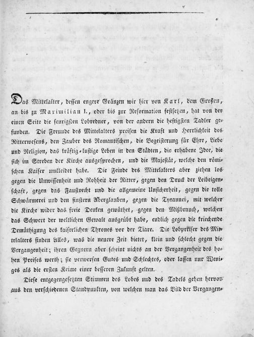 Das Mittelalter, deſſen engere Graͤnzen wir hier von Karl, dem Großen, an bis zu Maximilian IJ., oder bis zur Reformation feſtſetzen, hat von der einen Seite die feurigſten Lobredner, von der andern die heftigſten Tadler ge⸗ funden. Die Freunde des Mittelalters preiſen die Kraft und Herrlichkeit des Ritterweſens, den Zauber des Romantiſchen, die Begeiſterung fuͤr Ehre, Liebe und Religion, das kraͤftig⸗luſtige Leben in den Staͤdten, die erhabene Idee, die ſich im Streben der Kirche ausgeſprochen, und die Majeſtaͤt, welche den roͤmi⸗ ſchen Kaiſer umkleidet habe. Die Feinde des Mittelalters aber ziehen los gegen die Unwiſſenheit und Rohheit der Ritter, gegen den Druck der Leibeigen⸗ ſchaft, gegen das Fauſtrecht und die allgemeine Unſicherheit, gegen die tolle Schwaͤrmerei und den finſtern Aberglanben, gegen die Tyrannei, mit welcher die Kirche wider das freie Denken gewuͤthet, gegen den Mißbrauch, welchen das Schwert der weltlichen Gewalt ausgeuͤbt habe, endlich gegen die kriechende Demuͤthigung des kaiſerlichen Thrones vor der Tiare. Die Lobpreiſer des Mit⸗ telalters ſinden Alles, was die neuere Zeit bietet, klein und ſchlecht gegen die Vergangenheit; ihren Gegnern aber ſcheint nichts an der Vergangenheit des ho⸗ hen Preiſes werth; ſie verwerfen Gutes und Schlechtes, oder laſſen nur Weni⸗ ges als die erſten Keime einer beſſeren Zukunft gelten.