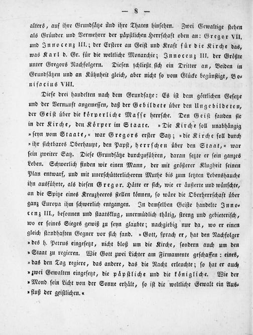 Dieſe drei handelten nach dem Grundſatze: Es iſt dem goͤttlichen Geſetze und der Vernunft angemeſſen, daß der Gebildete uͤber den U ngebildeten, der Geiſt uͤber die koͤrperliche Maſſe herrſche. Den Geiſt fanden ſie in der Kirche, den Koͤrper im Staate.»Die Kirche ſoll unabhaͤngig »ſeyn vom Staate,« war Gregors erſter Satz;»die Kirche ſoll durch »ihr ſichtbares Oberhaupt, den Papſt, herrſchen uͤber den Staat,« war ſein zweiter Satz. Dieſe Grundſaͤtze durchzufuͤhren, daran ſetzte er ſein ganzes Leben. Schwerlich finden wir einen Mann, der mit groͤßerer Klugheit ſeinen Plan entwarf, und mit unerſchuͤtterlicherem Muthe bis zum letzten Lebenshauche ihn ausfuͤhrte, als dieſen Gregor. Haͤtte er ſich, wie er aͤußerte und wuͤnſchte, an die Spitze eines Kreuzheeres ſtellen koͤnnen, ſo waͤre die Oberherrſchaft uͤber ganz Europa ihm ſchwerlich entgangen. In demſelben Geiſte handelte Inno⸗ cenz III., beſonnen und ſtaatsklug, unermuͤdlich thaͤtig, ſtreng und gebieteriſch, wo er ſeines Sieges gewiß zu ſeyn glaubte; nachgiebig nur da, wo er einen gleich ſtandhaften Gegner vor ſich fand.»Gott, ſprach er, hat den Nachfolger »des h. Petrus eingeſetzt, nicht bloß um die Kirche, ſondern auch um den »Staat zu regieren. Wie Gott zwei Lichter am Firmamente geſchaffen: eines, »das den Tag regiere, das andere, das die Nacht erleuchte; ſo hat er auch »zwei Gewalten eingeſetzt, die paͤpſtliche und die koͤnigliche. Wie der »Mond ſein Licht von der Sonne erhaͤlt, ſo iſt die weltliche Gewalt ein Aus⸗ „fluß der geiſtlichen.«