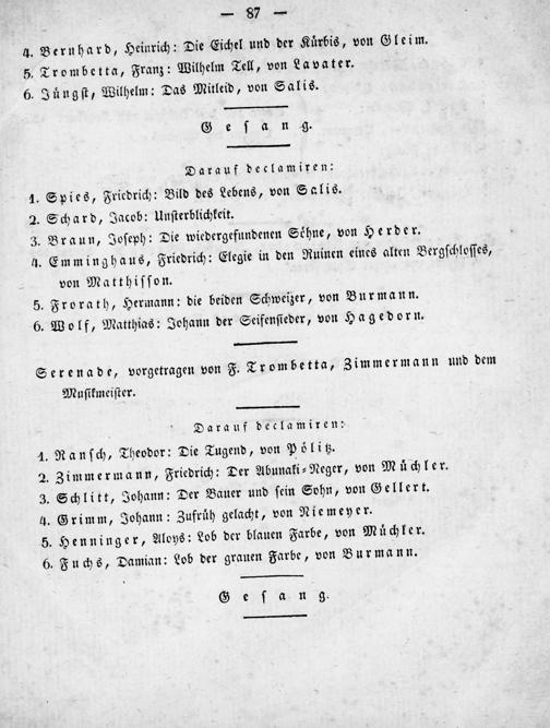 Darauf declamiren: 1. Spies, Friedrich: Bild des Lebens, von Salis. 2. Schard, Jacob: Unſterblichkeit. 3. Braun, Joſeph: Die wiedergefundenen Soͤhne, von Herder. 4. Emminghaus, Friedrich: Elegie in den Ruinen eines alten Bergſchloſſes, von Matthiſſon. 5. Frorath, Hermann: die beiden Schweizer, von Burmann. 6. Wolf, Matthias: Johann der Seifenſieder, von H agedorn.