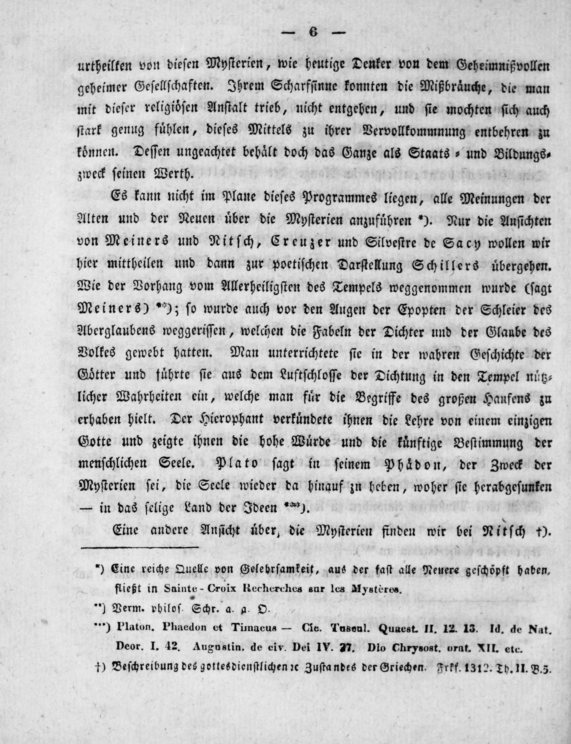Es kann nicht im Plane dieſes Programmes liegen, alle Meinungen der Alten und der Neuen uͤber die Myſterien anzufuͤhren*). Nur die Anſichten von Meiners und Nitſch, Creuzer und Silveſtre de Sacy wollen wir hier mittheilen und dann zur poetiſchen Darſtellung Schillers uͤbergehen. Wie der Vorhang vom Allerheiligſten des Tempels weggenommen wurde(ſagt Meiners)**); ſo wurde auch vor den Augen der Epopten der Schleier des Aberglaubens weggeriſſen, welchen die Fabeln der Dichter und der Glaube des Volkes gewebt hatten. Man unterrichtete ſie in der wahren Geſchichte der Goͤtter und fuͤhrte ſie aus dem Luftſchloſſe der Dichtung in den Tempel nuͤtz⸗ licher Wahrheiten ein, welche man fuͤr die Begriffe des großen Haufens zu erhaben hielt. Der Hierophant verkuͤndete ihnen die Lehre von einem einzigen Gotte und zeigte ihnen die hohe Wuͤrde und die kuͤnftige Beſtimmung der menſchlichen Seele. Plato ſagt in ſeinem Phaͤdon, der Zweck der Myſterien ſei, die Seele wieder da hinauf zu heben, woher ſie herabgeſunken — in das ſelige Land der Ideen*).