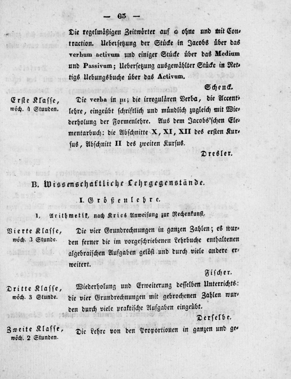 Die regelmaͤßigen Zeitwoͤrter auf o ohne und mit Con⸗ traction. Ueberſetzung der Stuͤcke in Jacobs uͤber das verhum activum und einiger Stuͤcke uͤber das Medium und Passivum; Ueberſetzung ausgewaͤhlter Stuͤcke in Ret⸗ tigs Uebungsbuche uͤber das Activum. Schenck. Erſte Klaſſe, Die verba in pe; die irregulaͤren Verba, die Accent⸗ woch. 4 Stuuden. lehre, eingeubt ſchriftlich und muͤndlich zugleich mit Wie⸗ derholung der Formenlehre. Aus dem Jacobs'ſchen Ele⸗ mentarbuch: die Abſchnitte X, XI, XII des erſten Kur⸗