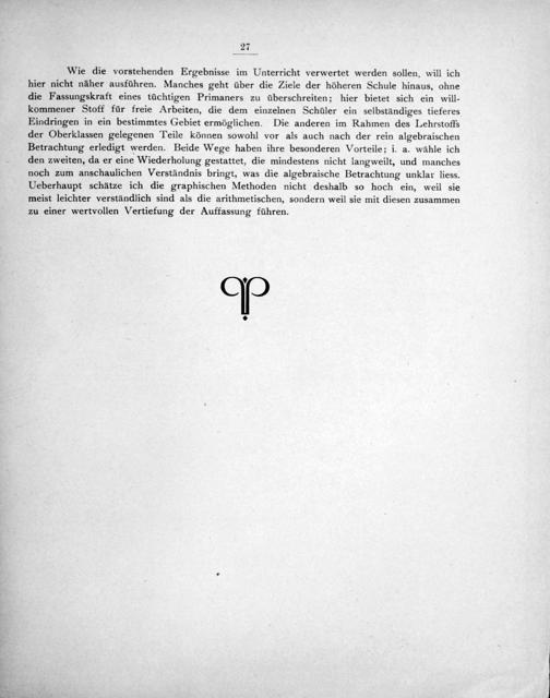 Wie die vorstehenden Ergebnisse im Unterricht verwertet werden sollen, will ich hier nicht näher ausführen. Manches geht über die Ziele der höheren Schule hinaus, ohne die Fassungskraft eines tüchtigen Primaners zu überschreiten; hier bietet sich ein will- kommener Stoff für freie Arbeiten, die dem einzelnen Schüler ein selbständiges tieferes Eindringen in ein bestimmtes Gebiet ermöglichen. Die anderen im Rahmen des Lehrstoffs der Oberklassen gelegenen Teile können sowohl vor als auch nach der rein algebraischen Betrachtung erledigt werden. Beide Wege haben ihre besonderen Vorteile; i. a. wähle ich den zweiten, da er eine Wiederholung gestattet, die mindestens nicht langweilt, und manches noch zum anschaulichen Verständnis bringt, was die algebraische Betrachtung unklar liess. Ueberhaupt schätze ich die graphischen Methoden nicht deshalb so hoch ein, weil sie meist leichter verständlich sind als die arithmetischen, sondern weil sie mit diesen zusammen zu einer wertvollen Vertiefung der Auffassung führen.