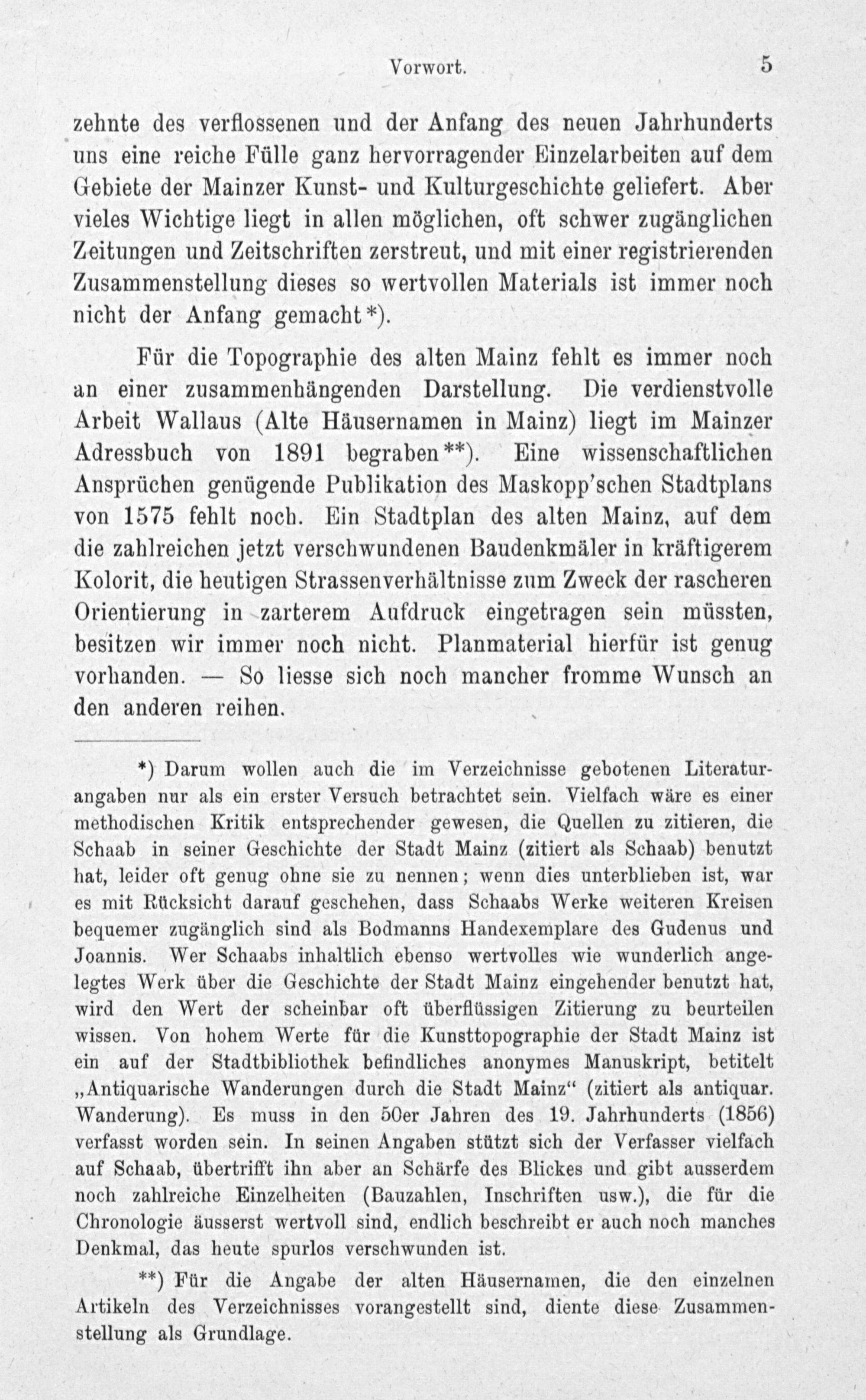*) Darum wollen auch die im Verzeichnisse gebotenen Literatur- angaben nur als ein erster Versuch betrachtet sein. Vielfach wäre es einer methodischen Kritik entsprechender gewesen, die Quellen zu zitieren, die Schaab in seiner Geschichte der Stadt Mainz(zitiert als Schaab) benutzt hat, leider oft genug ohne sie zu nennen; wenn dies unterblieben ist, war es mit Rücksicht darauf geschehen, dass Schaabs Werke weiteren Kreisen bequemer zugänglich sind als Bodmanns Handexemplare des Gudenus und Joannis. Wer Schaabs inhaltlich ebenso wertvolles wie wunderlich ange- legtes Werk über die Geschichte der Stadt Mainz eingehender benutzt hat, wird den Wert der scheinbar oft überflüssigen Zitierung zu beurteilen wissen. Von hohem Werte für die Kunsttopographie der Stadt Mainz ist ein auf der Stadtbibliothek befindliches anonymes Manuskript, betitelt „Antiquarische Wanderungen durch die Stadt Mainz“(zitiert als antiquar. Wanderung). Es muss in den 50er Jahren des 19. Jahrhunderts(1856) verfasst worden sein. In seinen Angaben stützt sich der Verfasser vielfach auf Schaab, übertrifft ihn aber an Schärfe des Blickes und gibt ausserdem noch zahlreiche Einzelheiten(Bauzahlen, Inschriften usw.), die für die Chronologie äusserst wertvoll sind, endlich beschreibt er auch noch manches Denkmal, das heute spurlos verschwunden ist.