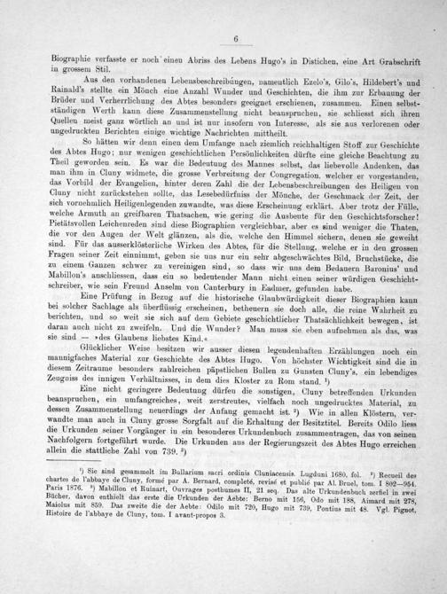 So hätten wir denn einen dem Umfange nach ziemlich reichhaltigen Stoff zur Geschichte des Abtes Hugo; nur wenigen geschichtlichen Persönlichkeiten dürfte eine gleiche Beachtung zu Theil geworden sein. Es war die Bedeutung des Mannes selbst, das liebevolle Andenken, das man ihm in Cluny widmete, die grosse Verbreitung der Congregation, welcher er vorgestanden, das Vorbild der Evangelien, hinter deren Zahl die der Lebensbeschreibungen des Heiligen von Cluny nicht zurückstehen sollte, das Lesebedürfniss der Mönche, der Geschmack der Zeit, der sich vornehmlich Heiligenlegenden zuwandte, was diese Erscheinung erklärt. Aber trotz der Fülle, welche Armuth an greifbaren Thatsachen, wie gering die Ausbeute für den Geschichtsforscher! Pietätsvollen Leichenreden sind diese Biographien vergleichbar, aber es sind weniger die Thaten, die vor den Augen der Welt glänzen, als die, welche den Himmel sichern, denen sie geweiht sind. Für das ausserklösterliche Wirken des Abtes, für die Stellung, welche er in den grossen Fragen seiner Zeit einnimmt, geben sie uns nur ein sehr abgeschwächtes Bild, Bruchstücke, die zu einem Ganzen schwer zu vereinigen sind, so dass wir uns dem Bedauern Baronius' und Mabillon's auschliessen, dass ein so bedeutender Mann nicht einen seiner würdigen Geschicht- schreiber, wie sein Freund Anselm von Canterbury in Eadmer, gefunden habe.