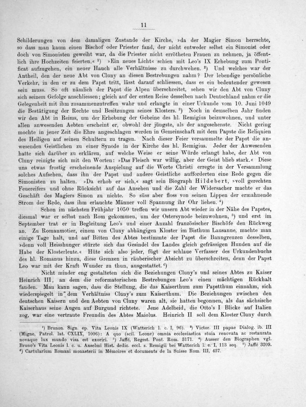 Schilderungen von dem damaligen Zustande der Kirche,»da der Magier Simon herrschte, so dass man kaum einen Bischof oder Priester fand, der nicht entweder selbst ein Simonist oder doch von Simonisten geweiht war, da die Priester nicht errötheten Frauen zu nehmen, ja öffent- lich ihre Hochzeiten feierten.« ¹)»Ein neues Licht« schien mit Leo's IX Erhebung zum Ponti- ficat aufzugehen, ein neuer Hauch alle Verhältnisse zu durchwehen. ²) Und welches war der Antheil, den der neue Abt von Cluny an diesen Bestrebungen nahm? Der lebendige persönliche Verkehr, in den er zu dem Papst tritt, lässt darauf schliessen, dass es ein bedeutender gewesen sein muss. So oft nämlich der Papst die Alpen überschreitet, sehen wir den Abt von Cluny sich seinem Gefolge anschliessen; gleich auf der ersten Reise desselben nach Deutschland nahm er die Gelegenheit mit ihm zusammenzutreffen wahr und erlangte in einer Urkunde vom 10. Juni 1049 die Bestätigung der Rechte und Besitzungen seines Klosters.*) Noch in demselben Jahr finden wir den Abt in Reims, um der Erhebung der Gebeine des hl. Remigius beizuwohnen, und unter allen anwesenden Aebten erscheint er, obwohl der jüngste, als der angesehenste. Nicht gering mochte in jener Zeit die Ehre angeschlagen werden in Gemeinschaft mit dem Papste die Reliquien des Heiligen auf seinen Schultern zu tragen. Nach dieser Feier versammelte der Papst die an- wesenden Geistlichen zu einer Synode in der Kirche des hl. Remigius. Jeder der Anwesenden hatte sich darüber zu erklären, auf welche Weise er seine Würde erlangt habe, der Abt von Cluny reinigte sich mit den Worten:»Das Fleisch war willig, aber der Geist blieb stark.« Diese uns etwas frostig erscheinende Anspielung auf die Worte Christi erregte in der Versammlung solches Aufsehen, dass ihn der Papst und andere Geistliche aufforderten eine Rede gegen die Simonisten zu halten.»Da erhob er sich,« sagt sein Biograph Hildebert,»voll gerechten Feuereifers und ohne Rücksicht auf das Ansehen und die Zahl der Widersacher machte er das Geschäft des Magiers Simon zu nichte. So süss aber floss von seinen Lippen der ermahnende Strom der Rede, dass ihm erlauchte Männer voll Spannung ihr Ohr liehen. ¹⁴)