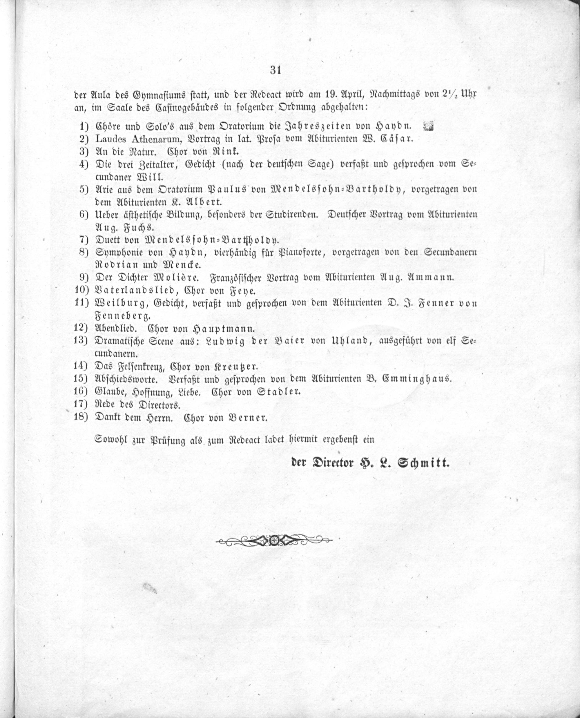 der Aula des Gymnaſiums ſtatt, und der Redeact wird am 19. April, Nachmittags von 2 ½ Uhr an, im Saale des Caſinogebäudes in folgender Ordnung abgehalten:
