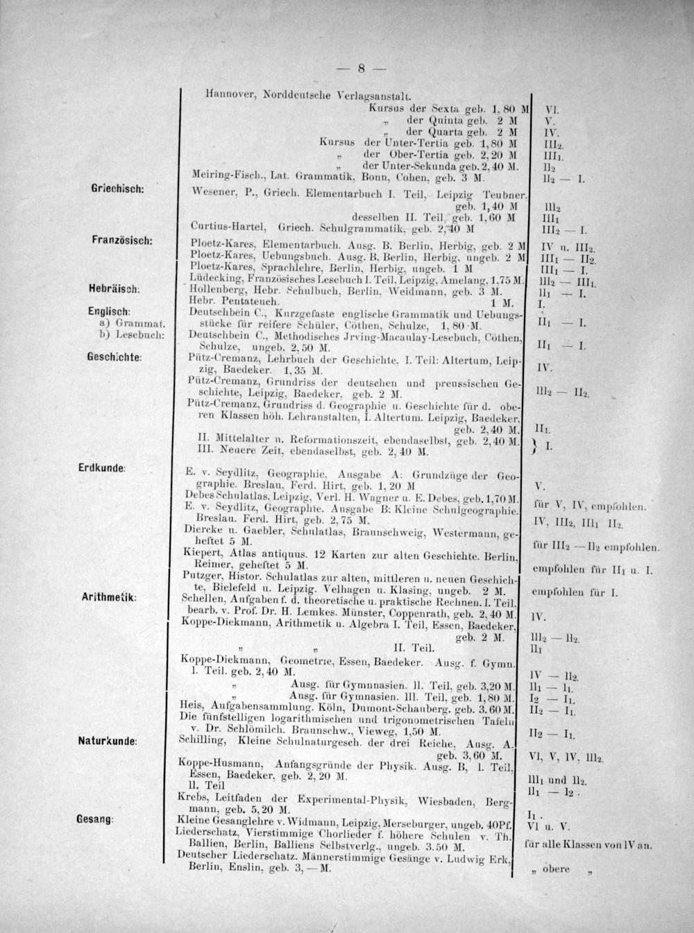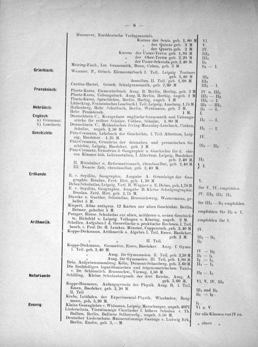 Hannover, Norddeutsche Verlagsanstalt. Kursus der Sexta geb. 1, 80 M. der Quinta geb. 2 M „ der Quarta geb. 2 M Kursus der Unter-Tertia geb. 1, 80 M der Ober-Tertia geb. 2, 20 M „ der Unter-Sekunda geb. 2, 40 M. Meiring-Fisch., Lat. Grammatik, Bonn, Cohen, geb. 3 M.