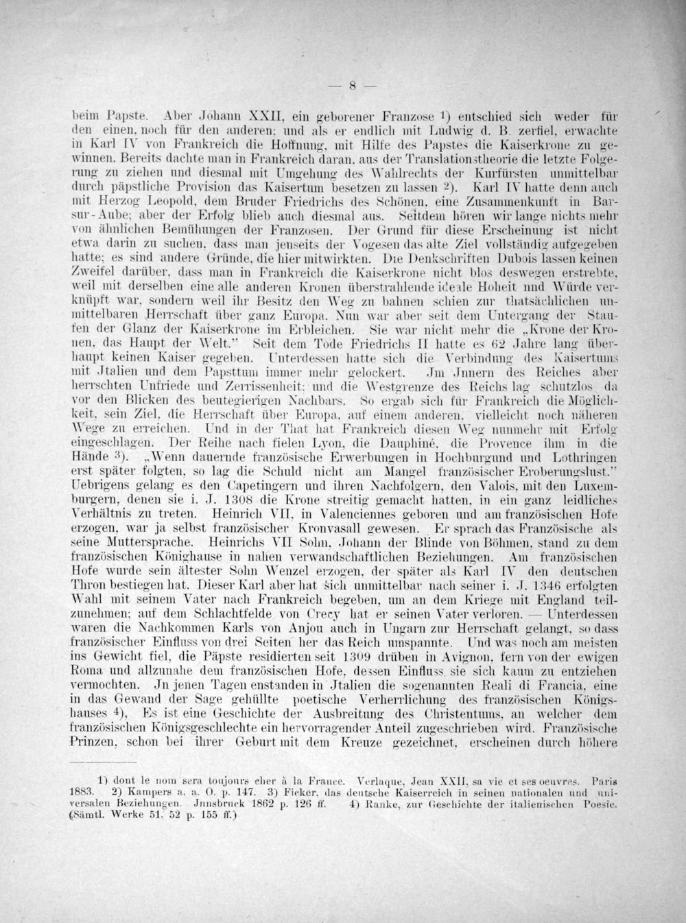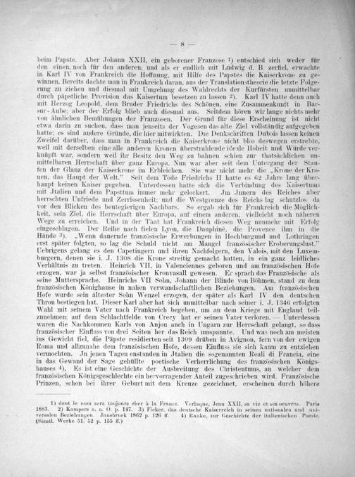 1) dont le nom sera toujonrs cher à la France. Verlaque, Jean XXII, sa vie et ses oeuvres. Paris 1883. 2) Kampers a. a. O. p. 147. 3) Ficker, das deutsche Kaiserreich in seinen nationalen und uni- versalen Beziehungen. Innsbruck 1862 p. 126 ff. 4) Ranke, zur Geschichte der italienischen Poesie. (Sämtl. Werke 51. 52 p. 155 ff.)