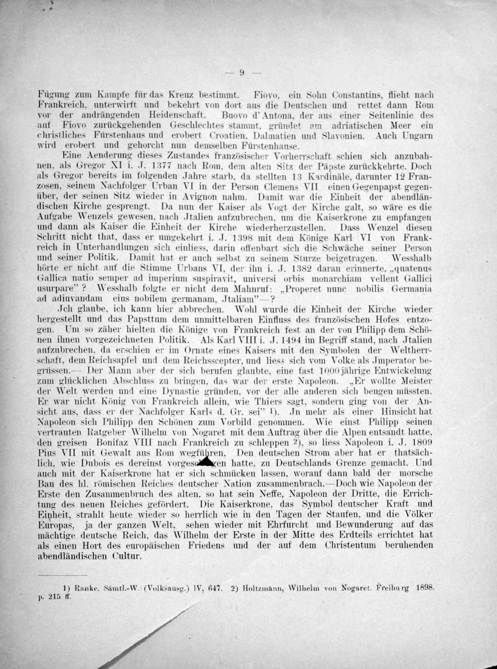 der Welt werden und eine Dynastie gründen, vor der alle anderen sich beugen müssten. Er war nicht König von Frankreich allein, wie Thiers sagt, sondern ging von der An- sicht aus, dass er der Nachfolger Karls d. Gr. sei“ ¹). In mehr als einer Hinsicht hat Napoleon sich Philipp den Schönen zum Vorbild genommen. Wiie einst Philipp seinen vertrauten Ratgeber Wilhelm von Nogaret mit dem Auftrag über die Alpen entsandt hatte, den greisen Bonifaz VIII nach Frankreich zu schleppen ²), so liess Napoleon i. J. 1809 Pius VII mit Gewalt aus Rom wegführen. Den deutschen Strom aber hat er thatsäch- lich, wie Dubois es dereinst nelhean hatte, zu Deutschlands Grenze gemacht. Und auch mit der Kaiserkrone hat er sich schmücken lassen, worauf dann bald der morsche Bau des hl. römischen Reiches deutscher Nation zusammenbrach.— Doch wie Napoleon der Erste den Zusammenbruch des alten. so hat sein Neffe, Napoleon der Dritte, die Errich- tung des neuen Reiches gefördert. Die Kaiserkrone, das Symbol deutscher Kraft und Einheit, strahlt heute wieder so herrlich wie in den Tagen der Staufen, und die Völker Europas, ja der ganzen Welt, sehen wieder mit Ehrfurcht und Bewunderung auf das mächtige deutsche Reich, das Wilhelm der Erste in der Mitte des Erdteils errichtet hat- als einen Hort des europäischen Friedens und der auf dem Christentum beruhenden abendländischen Cultur.