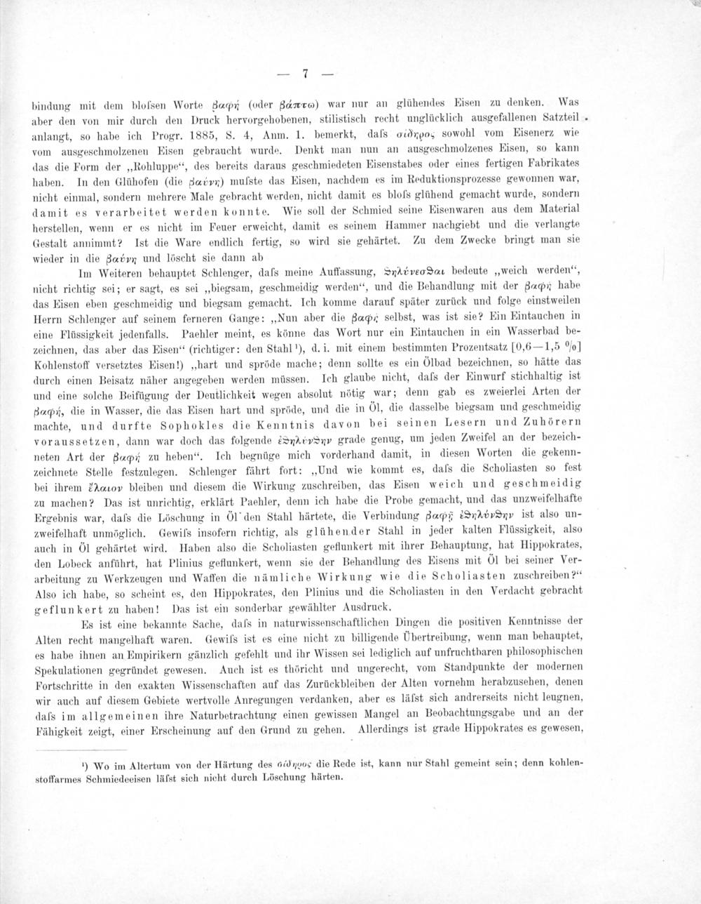 bindung mit dem bloſsen Worte 3—(öoder 8⁰πασmσόσ) war nur an glühendes Eisen zu denken. Was aber den von mir durch den Druck hervorgehobenen, stilistisch recht unglücklich ausgefallenen Satzteil anlangt, so habe ich Progr. 1885, S. 4, Anm. 1. bemerkt, dals Gιονποο⁸ sowohl vom Eisenerz wie vom ausgeschmolzenen Eisen gebraucht wurde. Denkt man nun an ausgeschmolzenes Eisen, so kann das die Form der„Rohluppe“, des bereits daraus geschmiedeten Eisenstabes oder eines fertigen Fabrikates haben. In den Glühofen(die garνrn) muſste das Eisen, nachdem es im Reduktionsprozesse gewonnen war, nicht einmal, sondern mehrere Male gebracht werden, nicht damit es bloſs glühend gemacht wurde, sondern damit es verarbeitet werden konnte. Wie soll der Schmied seine Eisenwaren aus dem Material herstellen, wenn er es nicht im Feuer erweicht, damit es seinem Hammer nachgiebt und die verlangte Gestalt annimmt? Ist die Ware endlich fertig, so wird sie gehärtet. Zu dem Zwecke bringt man sie wieder in die Savyn und löscht sie dann ab