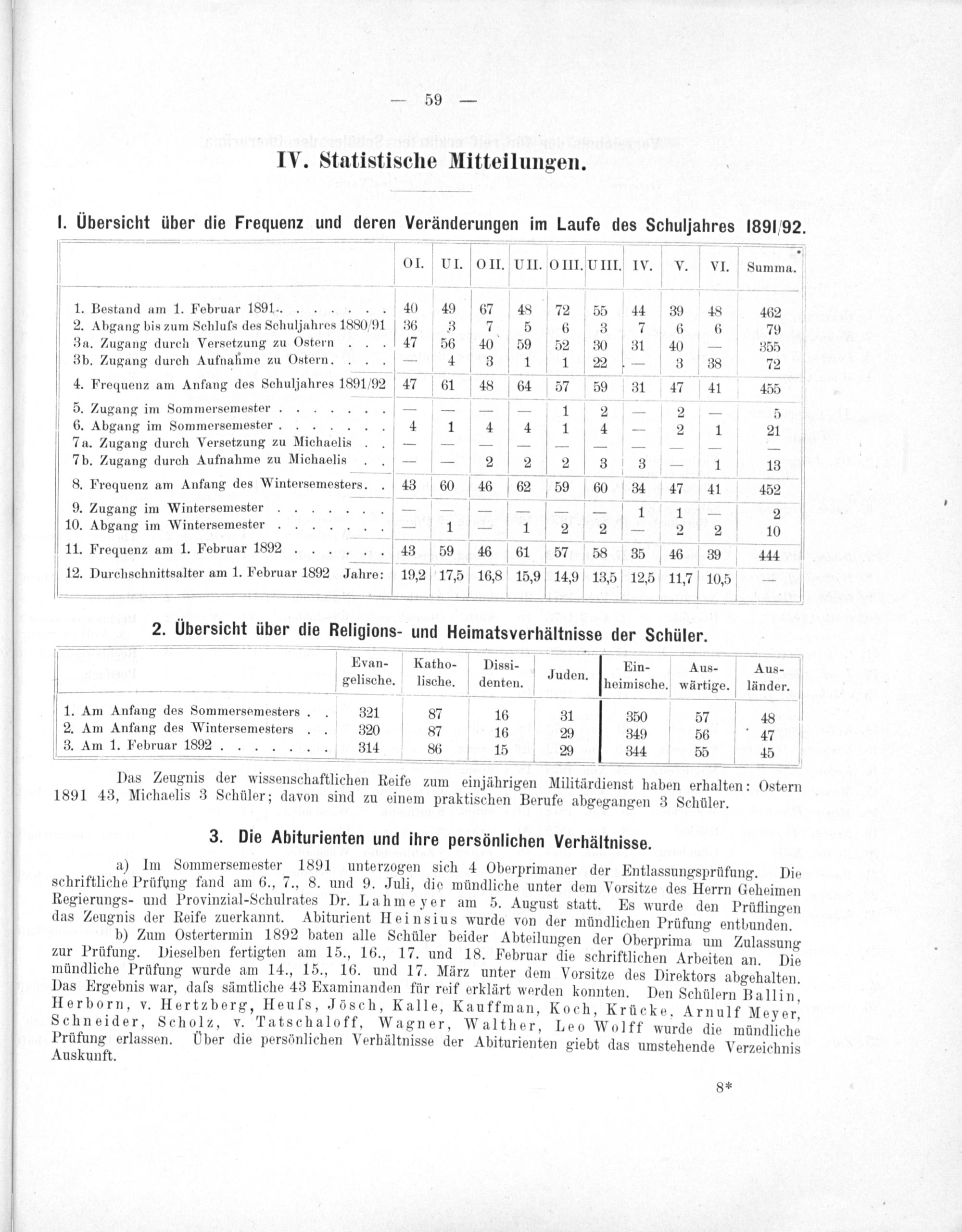 b) Zum Ostertermin 1892 baten alle Schüler beider Abteilungen der Oberprima um Zulassung zur Prüfung. Dieselben fertigten am 15., 16., 17. und 18. Februar die schriftlichen Arbeiten an. Die mündliche Prüfung wurde am 14., 15., 16. und 17. März unter dem Vorsitze des Direktors abgehalten. Das Ergebnis war, daſs sämtliche 43 Examinanden für reif erklärt werden konnten. Den Schülern Ballin, Herborn, v. Hertzberg, Heufs, Jösch, Kalle, Kauffman, Koch, Krücke. Arnulf Meyer, Schneider, Scholz, v. Tatschaloff, Wagner, Walther, Leo Wolff wurde die mündliche Prüfung erlassen. Über die persönlichen Verhältnisse der Abiturienten giebt das umstehende Verzeichnis Auskunft.