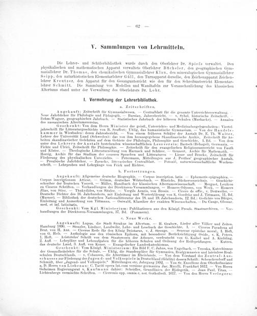 Angekauft: LZeitschrift für Gymnasialwesen.— Centralblatt für die gesamte Unterrichtsverwaltung.— Neue Jahrbücher für Philologie und Pädagogik.— Bursian, Jahresbericht.— v. Sybel, historische Zeitschrift.— Behm-Wagner, geographisches Jahrbuch.— Statistisches Jahrbuch der höheren Schulen(Mushacke).— Annalen des nassauischen Altertumsvereins.