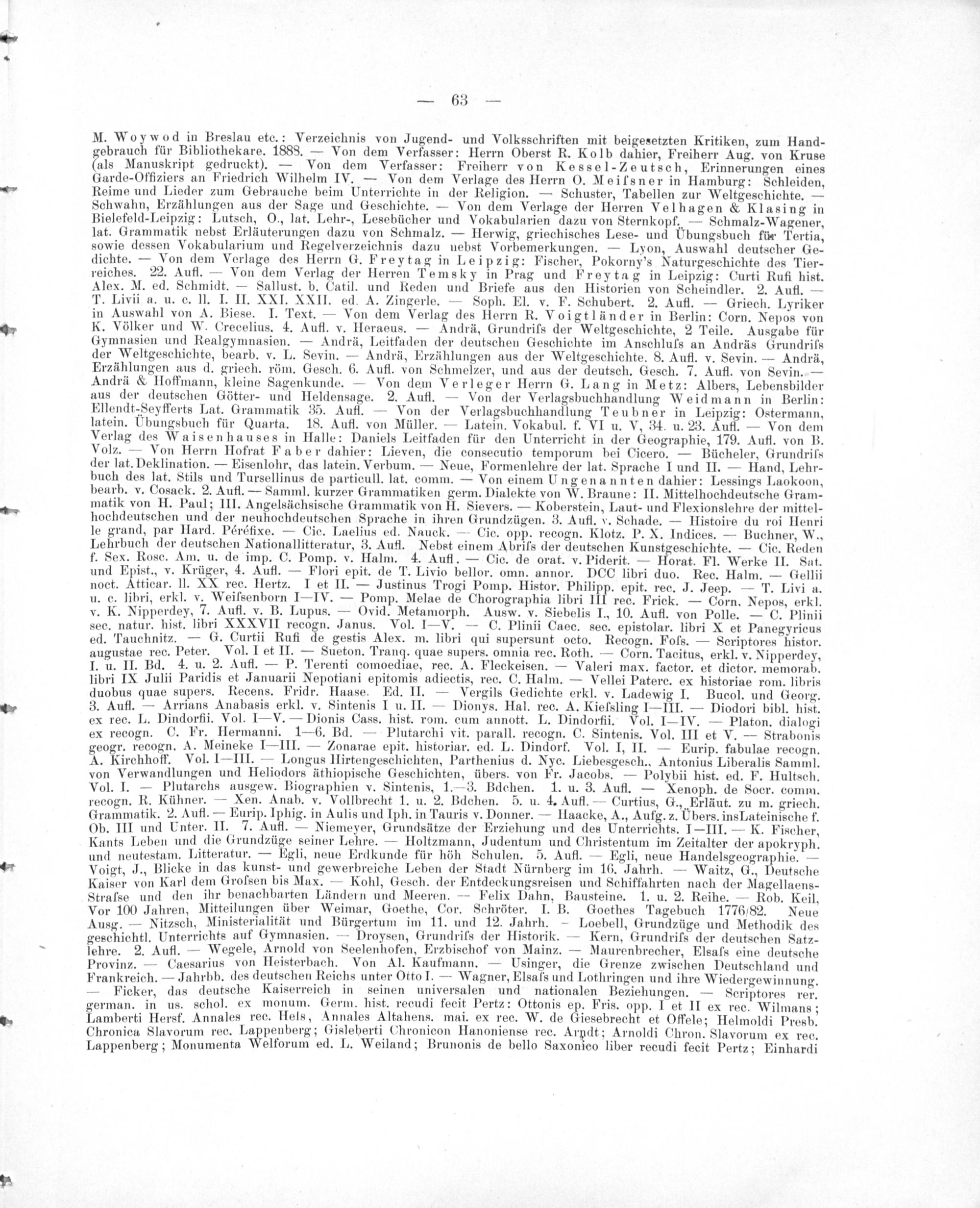 M. Woywod in Breslau etc.: Verzeichnis von Jugend- und Volksschriften mit beigesetzten Kritiken, zum Hand- gebrauch für Bibliothekare. 1888.— Von dem Verfasser: Herrn Oberst R. Kolb dahier, Freiherr Aug. von Kruse (als Manuskript gedruckt).— Von dem Verfasser: Freiherr von Kessel-Zeutsch, Erinnerungen eines Garde-Offiziers an Friedrich Wilhelm IV.— Von dem Verlage des Herrn O. Meifsner in Hamburg: Schleiden, Reime und Lieder zum Gebrauche beim Unterrichte in der Religion.— Schuster, Tabellen zur Weltgeschichte.— Schwahn, Erzühlungen aus der Sage und Geschichte.— Von dem Verlage der Herren Velhagen& Klasing in Bielefeld-Leipzig: Lutsch, O., lat. Lehr-, Lesebücher und Vokabularien dazu von Sternkopf.— Schmalz-Wagener, lat. Grammatik nebst Erläuterungen dazu von Schmalz.— Herwig, griechisches Lese- und UÜbungsbuch für Tertia, sowie dessen Vokabularium und Regelverzeichnis dazu uebst Vorbemerkungen.— Lyon, Auswahl deutscher Ge- dichte.— Von dem Verlage des Herrn G. Freytag in Leipzig: Fischer, Pokorny's Naturgeschichte des Tier- reiches. 22. Aufl.— Von dem Verlag der Herren Pemsky in Prag und Freytag in Leipzig: Curti Rufi hist. Alex. M. ed. Schmidt.— Sallust. b. Catil. und Reden und' Briefe aus den Historien von Scheindler. 2. Aufl.— T. Livii a. u. c. II. I. II. XXI. XXII. ed. A. Zingerle.— Soph. El. v. F. Schubert. 2. Aufl.— Griech. Lyriker in Auswahl von A. Biese. I. Text.— Von dem Verlag des Herrn R. Voigtländer in Berlin: Corn. Nepos von K. Völker und W. Crecelius. 4. Aufl. v. Heraeus.— Andrä, Grundrilfs der Weltgeschichte, 2 Teile. Ausgabe für Gymnasien und Realgymnasien.— Andrä, Leitfaden der deutschen Geschichte im Anschlufs an Andräs Grundrils der Weltgeschichte, bearb. v. L. Sevin.— Andrä, Erzählungen aus der Weltgeschichte. 8. Aufl. v. Sevin.— Andrä, Erzählungen aus d. griech. röm. Gesch. 6. Aufl. von Schmelzer, und aus der deutsch. Gesch. 7. Aufl. von Sevin.—