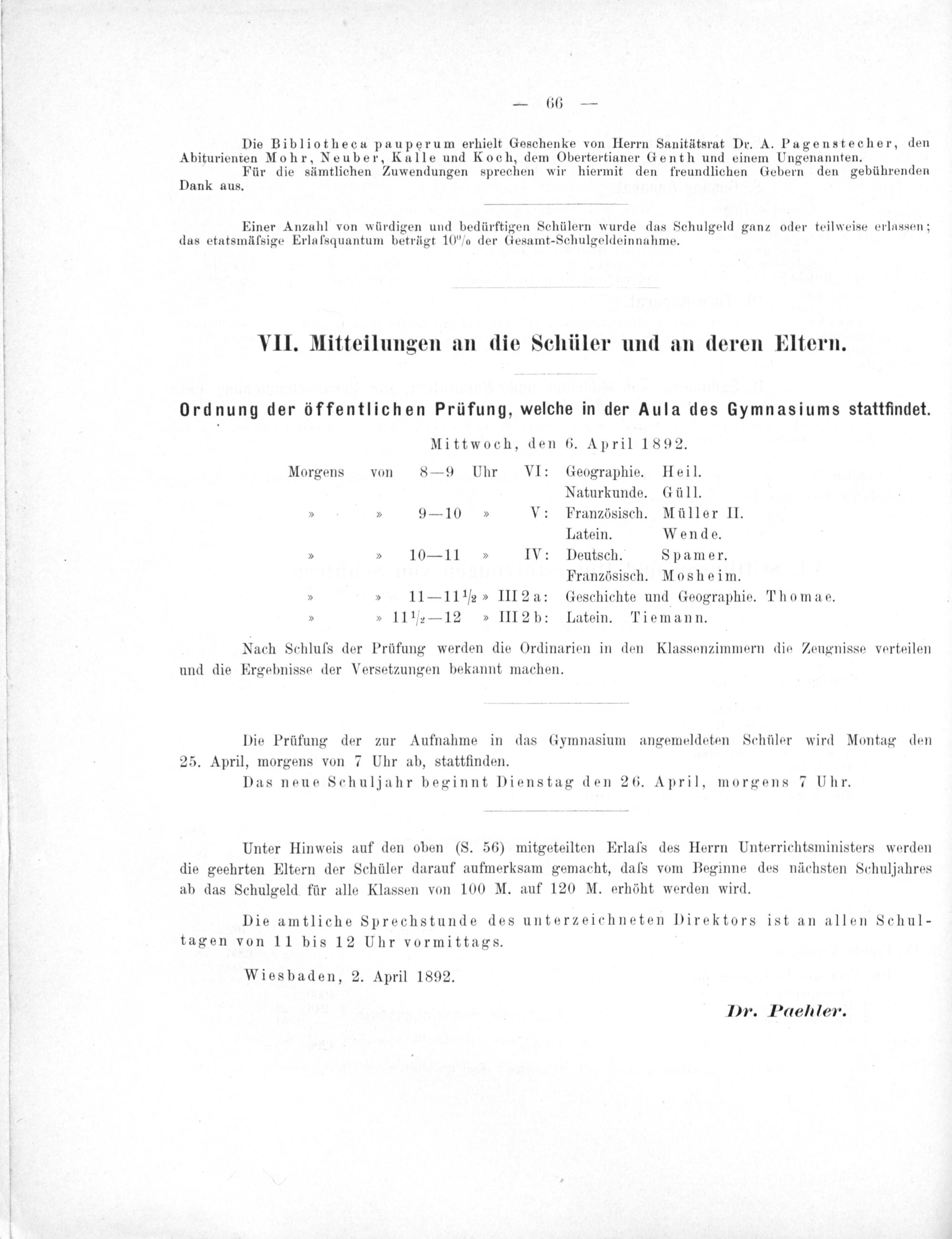 Die Bibliotheca pauperum erhielt Geschenke von Herrn Sanitätsrat Dr. A. Pagenstecher, den Abiturienten Mohr, Neuber, Kalle und Koch, dem Obertertianer Genth und einem Ungenannten.