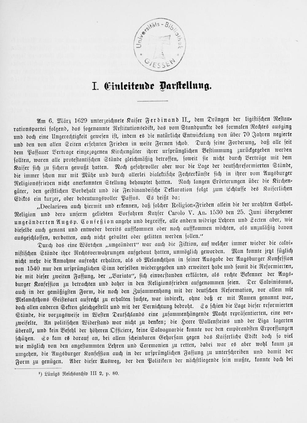Am 6. März 1629 unterzeichnete Kaiſer Ferdinand II., dem Drängen der ligiſtiſchen Reſtau⸗ rationspartei folgend, das ſogenannte Reſtitutionsedikt, das vom Standpunkte des formalen Rechtes ausging und doch eine Ungerechtigkeit geweſen iſt, indem es die natürliche Entwickelung von über 70 Jahren negierte und den von allen Seiten erſehnten Frieden in weite Fernen ſchob. Durch ſeine Forderung, daß alle ſeit dem Paſſauer Vertrage eingezogenen Kirchengüter ihrer urſprünglichen Beſtimmung zurückgegeben werden ſollten, waren alle proteſtantiſchen Stände gleichmäßig betroffen, ſoweit ſie nicht durch Verträge mit dem Kaiſer ſich zu ſichern gewußt hatten. Noch gefahrvoller aber war die Lage der deutſchreformierten Stände, die immer ſchon nur mit Mühe und durch allerlei dialektiſche Fechterkünſte ſich in ihrer vom Augsburger Religionsfrieden nicht anerkannten Stellung behauptet hatten. Nach langen Erörterungen über die Kirchen⸗ güter, den geiſtlichen Vorbehalt und die Ferdinandeiſche Deklaration folgt zum Schluſſe des Kaiſerlichen Edikts ein kurzer, aber bedeutungsvoller Paſſus. Es heißt da: