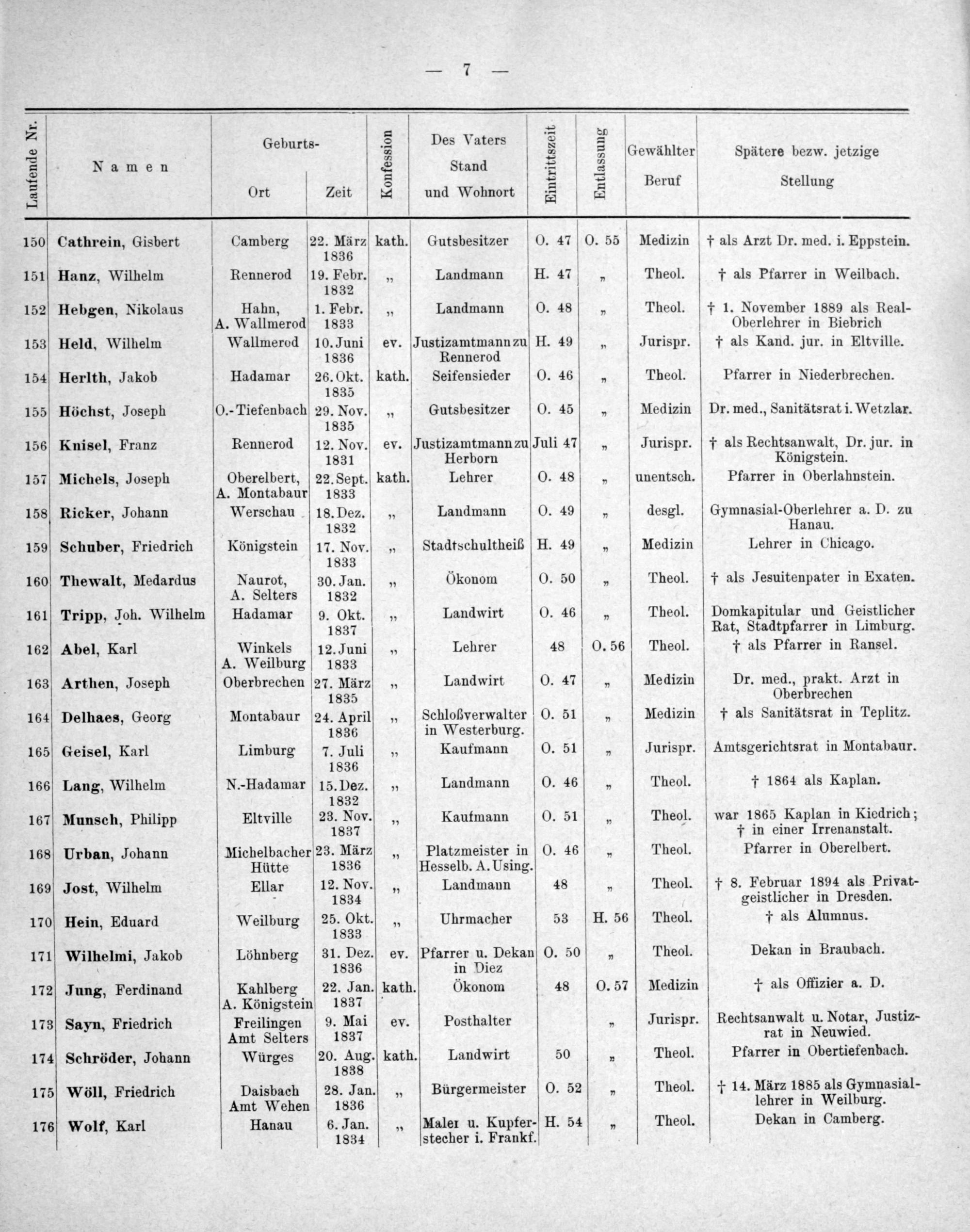 8= 8 7 Geburts-.5 Pes Vaters 582 2 Lbuebs 5 8 2(Gewählter Spätere bezw. jetzige 5 Namen 5 Stand 2 V 3 —.—— Ber 5 Ort Zeit 3 und Wohnort 5 V E V eruf V Stellung 150Cathrein, Gisbert Camberg 22. März kath. Gutsbesitzer O. 47 V O0. 55 Medizin † als Arzt Dr. med. i. Eppstein. 1836 151 Hanz, Wilhelm Rennerod[19. Febr.„ Landmann H. 47„ Theol. † als Pfarrer in Weilbach. 183² 152 Hebgen, Nikolaus Hahn, 1. Febr.„ Landmann O. 48„ Theol. † 1. November 1889 als Real- A. Wallmerod 1833 Oberlehrer in Biebrich 153 Held, Wilhelm Wallmerod 10. Juni- ev. Justizamtmannzu H. 49„ Jurispr. † als Kand. jur. in Eltville. 1836 Rennerod 154 Herlth, Jakob Hadamar 26. Okt. kath. Seifensieder O. 46 5 Theol. Pfarrer in Niederbrechen. 1835 155 Höchst, Joseph O.-Tiefenbach 29. Nov.„ Gutsbesitzer O. 45„ Medizin Dr. med., Sanitätsrat i. Wetzlar. 1835 156 Knisel, Franz Rennerod 12. Nov. ev. Justizamtmann zu Juli 47„ Jurispr. † als Rechtsanwalt, Dr. jur. in 1831 Herborn Königstein. 157 Michels, Joseph Oberelbert, 22. Sept. kath. Lehrer O. 48„(uuentsch. Pfarrer in Oberlahnstein. A. Montabaur 1833 158 Ricker, Johann Werschau 18. Dez.„ Landmann O. 49„ desgl. Gymnasial-Oberlehrer a. D. zu 1832 Hanau. 159 Schuber, Friedrich Königstein 17. Nov.„ Stadtschultheiß H. 49„ Medizin Lehrer in Chicago. 1833 160 Thewalt, Medardus Naurot, 30. Jan.„ Okonom 0. 50„ Theol. † als Jesuitenpater in Exaten. A. Selters 1832 161 Tripp, Joh. Wilhelm Hadamar 9. Okt.„ Landwirt O. 46„ Theol. Domkapitular und Geistlicher 1837 Rat, Stadtpfarrer in Limburg. 162 Abel, Karl Winkels 12. Juni„ Lehrer 48 0O. 56 Theol. † als Pfarrer in Ransel. A. Weilburg 1833 163 Arthen, Joseph Oberbrechen 27. März„ Landwirt O. 47„ Medizin Dr. med., prakt. Arzt in 1835 Oberbrechen 164 Delhaes, Georg Montabaur 24. Aprill„ Schloßverwalter O. 51„ Medizin † als Sanitätsrat in Teplitz. 1836 in Westerburg. 165 Geisel, Karl Limburg 7. Juli„ Kaufmann O. 51„ Jurispr. Amtsgerichtsrat in Montabaur. 1836 166 Lang, Wilhelm N.-Hadamar 15. Dez.„ Landmann O. 46„ Theol. † 1864 als Kaplan. 1832 167 Munsch, Philipp Eltville 23. Nov.„ Kaufmann O. 51„ Theol. war 1865 Kaplan in Kiedrich; 1837 4 † in einer Irrenanstalt. 168 Urban, Johann Michelbacher 23. März„ Platzmeister in O. 46„ Theol. Pfarrer in Oberelbert. Hütte 1836 Hesselb. A. Using. 169 Jost, Wilhelm Ellar 12. Nov.„ Landmann 48„ Theol. † 8. Februar 1894 als Privat- 3 1834 geistlicher in Dresden. 170 Hein, Eduard Weilburg 25. Okt.]„ Uhrmacher 53 H. 56 heol. † als Alumnus. 1833 171 Wilhelmi, Jakob Löhnberg 31. Dez.] ev. Pfarrer u. Dekan O. 50„ Theol. Dekan in Braubach. 1836 in Diez 172 Jung, Ferdinand Kahlberg 22. Jan. kath. Okonom 48 O0. 57 Medizin † als Offizier a. D. A. Königstein 1837 173 Sayn, Friedrich Freilingen 9. Mai ev. Posthalter„ Jurispr. Rechtsanwalt u. Notar, Justiz- Amt Selters 1837 rat in Neuwied. 174 Schröder, Johann Würges 20. Aug. kath. Landwirt 50* Theol. Pfarrer in Obertiefenbach. 1838 175 Wöll, Friedrich Daisbach 28. Jan.„ Bürgermeister O. 52„ Theol. † 14. März 1885 als Gymnasial- Amt Wehen 1836 lehrer in Weilburg. 176 Wolf, Karl Hanau 6. Jan.„ Maler u. Kupfer- H. 54„ Theol. Dekan in Camberg. 1834 stecher i. Frankf.