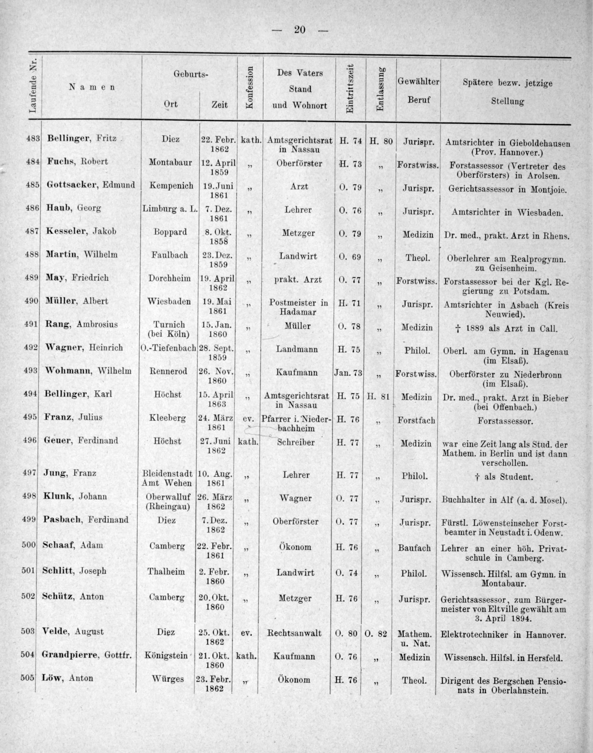 — 20— 2 5 V 2 5 89 rs. 5 Des Vaters 8 S Geburts 5 2 Gewählter Spätere bezw. jetzige 8 Namen 4 Stand 5 8 1 2 2 Beruf 2 Ort Zeit= und Wohnort er Itellung 24 483 Bellinger, Fritz Diez 2 Pohe wan Amtsgerichtsrat H. 74 H. 8S0 Jurispr. Amtsrichter in Gieboldehausen 1862 in Nassau(Prov. Hannover.) 484 Fuchs, Robert Montabaur 12. Aprill„ Oberförster H. 736„ Forstwiss. Forstassessor(Vertreter des 1859 Oberförsters) in Arolsen. 485 Gottsacker, Edmund Kempenich 19. Juni„ Arzt 0. 79„ Jurispr. Gerichtsassessor in Montjoie. 1861 486 Haub, Georg Limburg a. L. 7. Dez„ Lehrer O. 76 3 Jurispr. Amtsrichter in Wiesbaden. 1861 487 Kesseler, Jakob Boppard 8. Okt„ Metzger O0. 79„ Medizin Dr. med., prakt. Arzt in Rhens. 1858 488 Martin, Wilhelm Faulbach 23. Dez„ Landwirt 0. 69„ Theol. Oberlehrer am Realprogymn. 1859. zu Geisenheim. 489 May, Friedrich Dorchheim[19. April„ prakt. Arzt 0. 77„ Forstwiss. Forstassessor bei der Kgl. Re- 186² gierung zu Potsdam. 490 Müller, Albert Wiesbaden 19. Mai„ Postmeister in H. 710„ Jurispr. Amtsrichter in Asbach(Kreis 1861 Hadamar Neuwied). 491 Rang, Ambrosius Turnich 15. Jan.„ Müller 0. 78„ Medizin † 1889 als Arzt in Call. (bei Köln) 1860 1 492 Wagner, Heinrich(O.-Tiefenbach28. Sept.„ Landmann H. 75„ Philol. Oberl. am Gymn. in Hagenau 1859(im Elsaß). 493 Wohmann, Wilhelm Rennerod 26. Nov.)]„ Kaufmann Jan. 736„ Forstwiss. Oberförster zu Niederbronn 1860(im Elsaß). 494 Bellinger, Karl Höchst 15. Aprill„ Amtsgerichtsrat H. 75 H. S! Medizin Dr. med., prakt. Arzt in Bieber 1863 in Nassau(bei Offenbach.) 495 Franz, Julius Kleeberg 24. März ev. Pfarrer i. Nieder- H. 76„ Forstfach Forstassessor. 1861* bachheim 496 Geuer, Ferdinand Höchst 27. Juni kath. Schreiber H. 77„ Medizin war eine Zeit lang als Stud. der 1862 Mathem. in Berlin und ist dann verschollen. 497 Jung, Franz Bleidenstadt 10. Aug.„ Lehrer H. 77„ Philol † als Student. Amt Wehen 1861 V 498 Klunk, Johann Oberwalluf 26. März„ Wagner O. 77„ Jurispr. Buchhalter in Alf(a. d. Mosel). (Rheingau) 1862 499 Pasbach, Ferdinand Die⸗z 7. Dez.„ Oberförster O0. 77„ Jurispr. Fürstl. Löwensteinscher Forst- 1862 beamter in Neustadt i. Odenw. 500 Schaaf, Adam Camberg 22. Febr.„ Okonom H. 76„ Baufach Lehrer an einer höh. Privat- 1861 schule in Camberg. 501 Schlitt, Joseph Thalheim 2. Febr.„ Landwirt O. 74„ Philol. Wissensch. Hilfsl. am Gymn. in 1860 Montabaur. 502 Schütz, Anton Camberg 20. Okt.„ Metzger H. 76„ Jurispr. Gerichtsassessor, zum Bürger- 1860 meister von Eltville gewählt am 3. April 1894. 503 Velde, August Diez 25. Okt. ev. Rechtsanwalt O. 80 O. 82 Mathem. Elektrotechniker in Hannover. 1862 u. Nat. 504 Grandpierre, Gottfr. Königstein 21. Okt. kath. Kaufmann 0. 76„ Medizin Wissensch. Hilfsl. in Hersfeld. 1860 505 Löw, Anton Würges 23. Febr.]„ Okonom H. 76„ Theol. Dirigent des Bergschen Pensio- 1862 nats in Oberlahnstein.