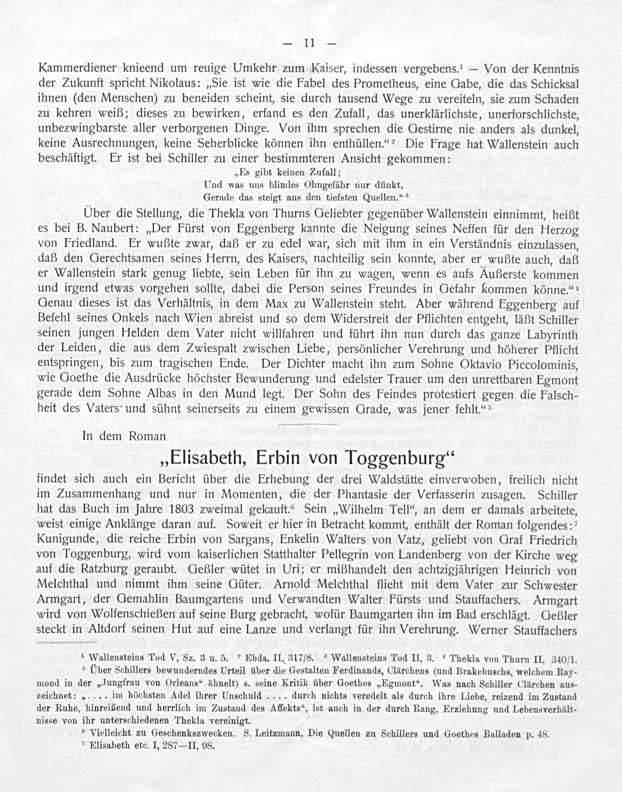Kammerdiener knieend um reuige Umkehr zum Kaiser, indessen vergebens.“— Von der Kenntnis der Zukunft spricht Nikolaus:„Sie ist wie die Fabel des Prometheus, eine Gabe, die das Schicksal ihnen(den Menschen) zu beneiden scheint, sie durch tausend Wege zu vereiteln, sie zum Schaden zu kehren weiß; dieses zu bewirken, erfand es den Zufall, das unerklärlichste, unerforschlichste, unbezwingbarste aller verborgenen Dinge. Von ihm sprechen die Gestirne nie anders als dunkel, keine Ausrechnungen, keine Seherblicke können ihn enthüllen.“² Die Frage hat Wallenstein auch beschäftigt. Er ist bei Schiller zu einer bestimmteren Ansicht gekommen: „Es gibt keinen Zufall; Und was uns blindes Ohngefähr nur dünkt, Gerade das steigt aus den tiefsten Quellen.“³
