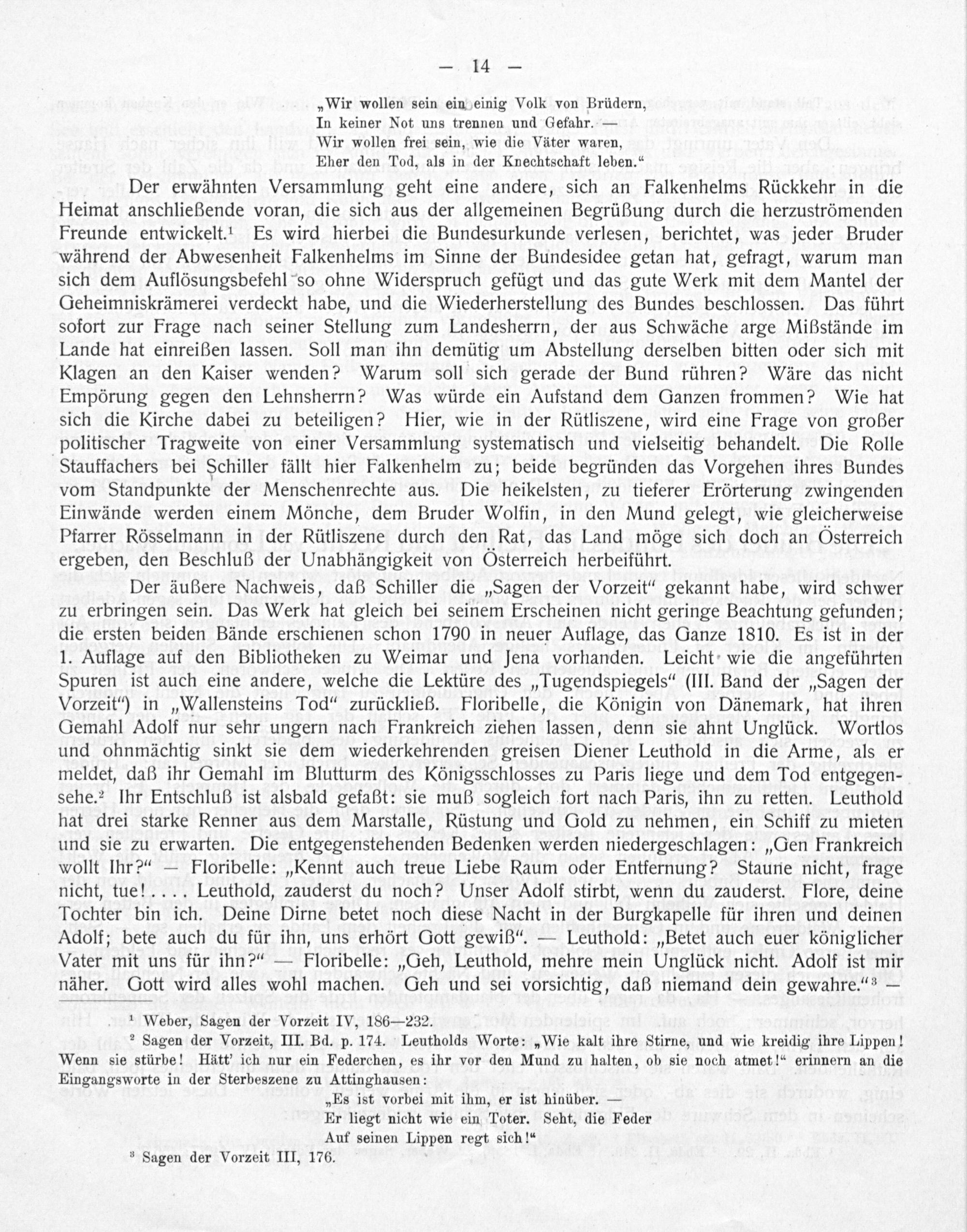 ¹ Weber, Sagen der Vorzeit IV, 186—232. ² Sagen der Vorzeit, III. Bd. p. 174. Leutholds Worte:„Wie kalt ihre Stirne, und wie kreidig ihre Lippen! Wenn sie stürbe! Hätt' ich nur ein Federchen, es ihr vor den Mund zu halten, ob sie noch atmet!“ erinnern an die Eingangsworte in der Sterbeszene zu Attinghausen: „Es ist vorbei mit ihm, er ist hinüber.— Er liegt nicht wie ein Toter. Seht, die Feder Auf seinen Lippen regt sich!“ 3³ Sagen der Vorzeit III, 176.
