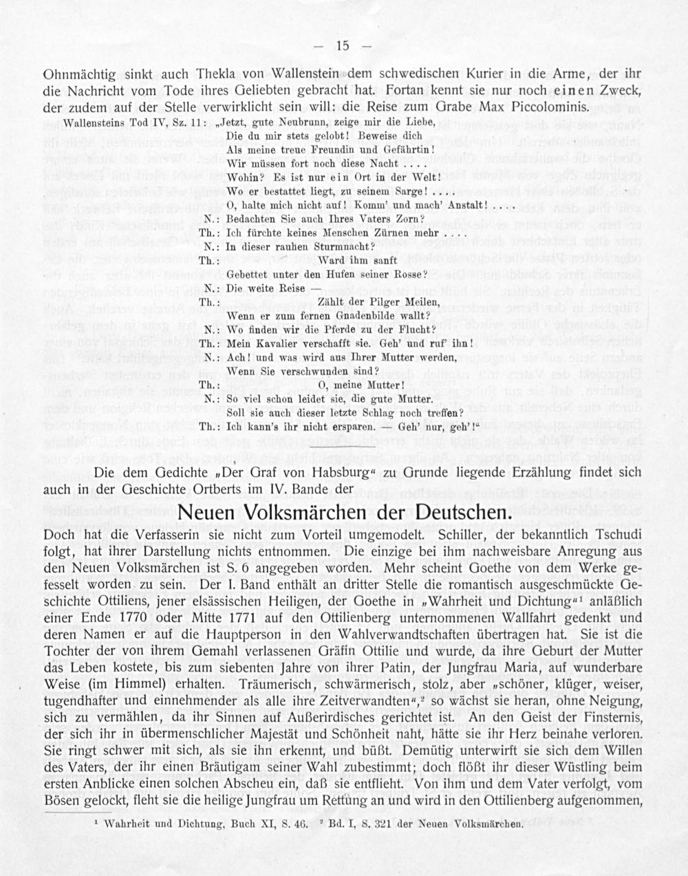 Doch hat die Verfasserin sie nicht zum Vorteil umgemodelt. Schiller, der bekanntlich Tschudi folgt, hat ihrer Darstellung nichts entnommen. Die einzige bei ihm nachweisbare Anregung aus den Neuen Volksmärchen ist S. 6 angegeben worden. Mehr scheint Goethe von dem Werke ge- fesselt worden zu sein. Der IJ. Band enthält an dritter Stelle die romantisch ausgeschmückte Ge- schichte Ottiliens, jener elsässischen Heiligen, der Goethe in„Wahrheit und Dichtung“i anläßlich einer Ende 1770 oder Mitte 1771 auf den Ottilienberg unternommenen Wallfahrt gedenkt und deren Namen er auf die Hauptperson in den Wahlverwandtschaften übertragen hat. Sie ist die Tochter der von ihrem Gemahl verlassenen Oräfin Ottilie und wurde, da ihre Geburt der Mutter das Leben kostete, bis zum siebenten Jahre von ihrer Patin, der Jungfrau Maria, auf wunderbare Weise(im Himmel) erhalten. Träumerisch, schwärmerisch, stolz, aber„schöner, klüger, weiser, tugendhafter und einnehmender als alle ihre Zeitverwandten“,? so wächst sie heran, ohne Neigung, sich zu vermählen, da ihr Sinnen auf Außerirdisches gerichtet ist. An den Geist der Finsternis, der sich ihr in übermenschlicher Majestät und Schönheit naht, hätte sie ihr Herz beinahe verloren. Sie ringt schwer mit sich, als sie ihn erkennt, und büßt. Demütig unterwirft sie sich dem Willen des Vaters, der ihr einen Bräutigam seiner Wahl zubestimmt; doch flößt ihr dieser Wüstling beim ersten Anblicke einen solchen Abscheu ein, daß sie entflieht. Von ihm und dem Vater verfolgt, vom Bösen gelockt, fleht sie die heilige Jungfrau um Rettung an und wird in den Ottilienberg aufgenommen,