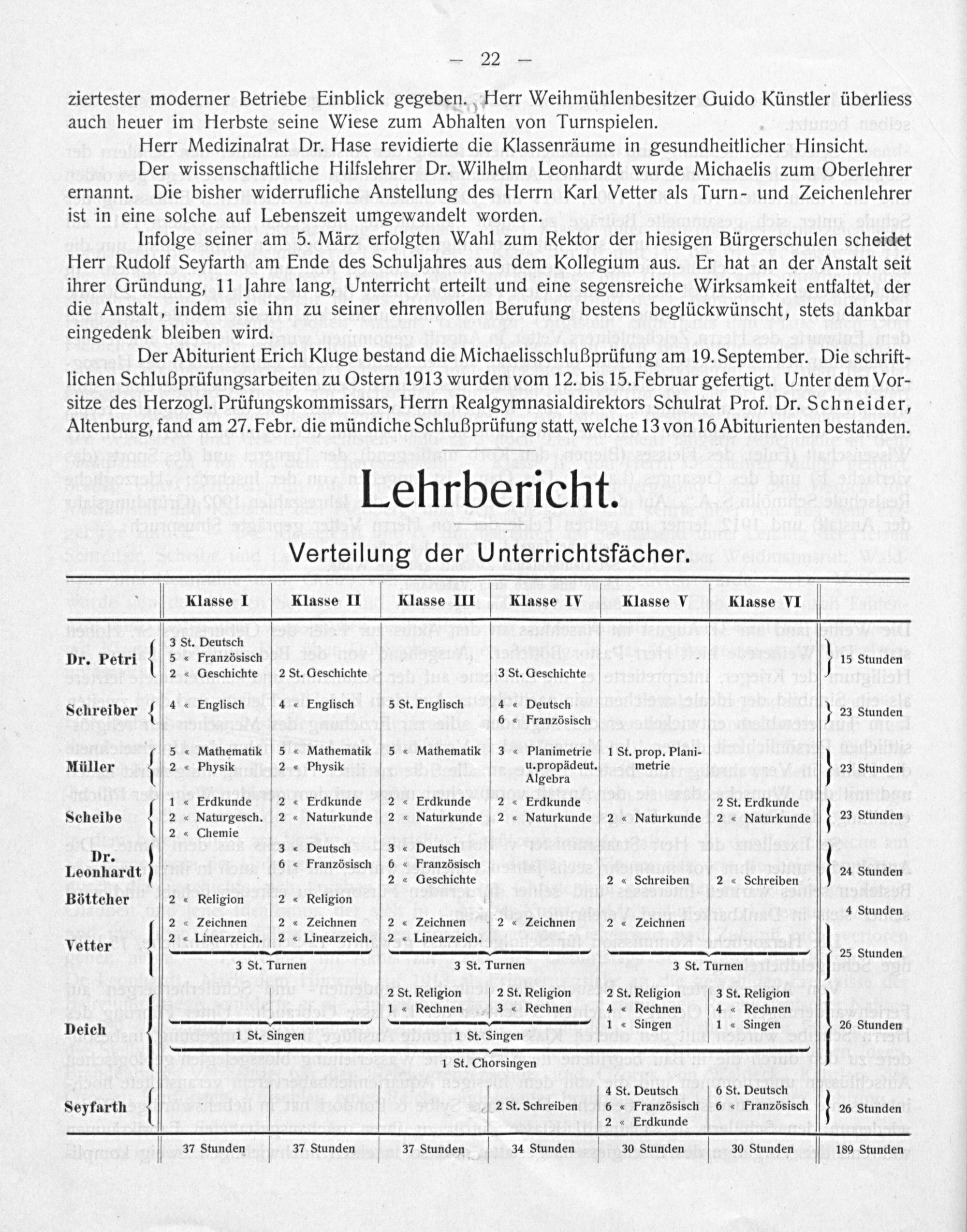 Klasse I Klasse II Klasse III Klasse IV. Klasse V Klasse VI 3 St. Deutsch Dr. Petri 5 Französisch 15 Stunden 2 Geschichte 2 St. Geschichte 3 St. Geschichte Schreiber— 4 Englisch 4 Englisch 5 St. Englisch 4 Deutsch— 23 Stunden S 6 Französisch 5 Mathematikk 5 Mathematilc 5 Mathematilc 3 Planimetrie 1 St. prop. Plani- Müller 2 ⸗* Physik 2 Physik u. propädeut. metrie 23 Stunden Algebra 1 ᷣ Erdkunde 2 Erdkunde 2 Erdkunde 2 Erdkunde 2 St. Erdkunde Scheibe 2 Naturgesch. 2 Naturkunde 2 Naturkunde 2 Naturkunde 2%Naturkunde 2 Naturkunde 23 Stunden 2 Chemie Dr. 3 Deutsch 3 Deutsch . 6 Französisch 6 Französisch 24 St Leonhardt 2 Geschichte 2. Schreiben 2 Schreiben ünden Böttcher 2 Religion 2 Religion 4 Stunden 2 LZeichnen 2.ç Zeichnen 2 Zeichnen[2 Zeichnen 2.α Zeichnen vett— 2 Linearzeich. 2 Linearzeich. 2 Linearzeich. etter 25 Stunden 3 St. Turnen 3 St. Turnen 3 St. Turnen— 2 St. Religion 2 St. Religion 2 St. Religion 3 St. Religion 1 Rechnen 3 Rechnen 4 Rechnen 4 Rechnen . 1 u Singen 1.ç Singen 26 Stunden Deich 1 St. Singen 1 St. Singen 1 St. Chorsingen 4 St. Deutsch 6 St. Deutsch Seyfarth( 2 St. Schreiben 6 Französisch 6 Französisch 26 Stunden 2 Erdkunde 37 Stunden V 37 Stunden 37 Stunden V 34 Stunden 30 Stunden 30 Stunden 189 Stunden